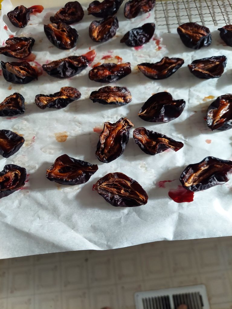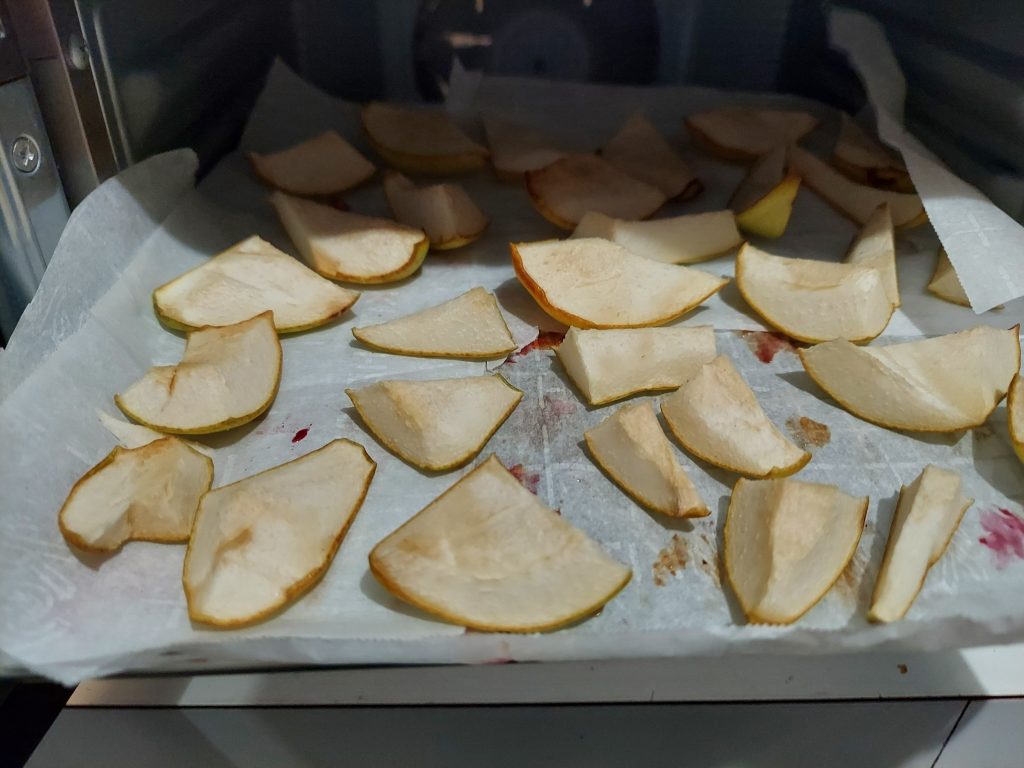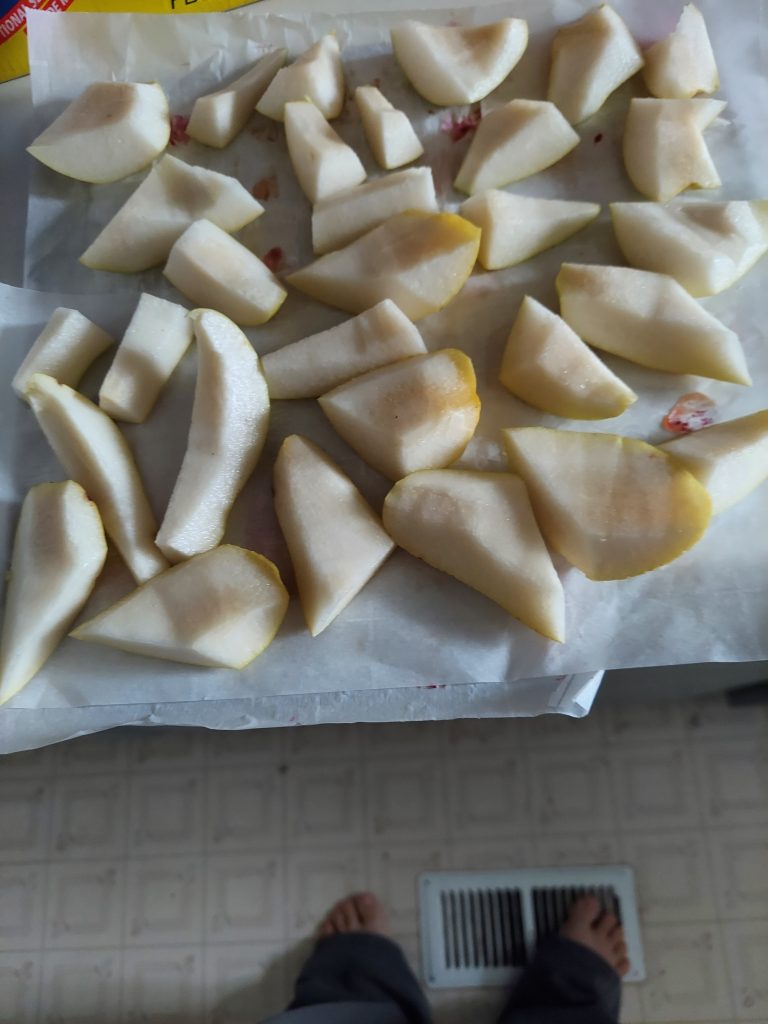 After I took the prunes out I chopped up some pears and stuck them in the dehydrator. They’ll need more time tomorrow, but I got them started tonight. I took a piece that was partially done and it was like a warm dessert pear. Delicious.