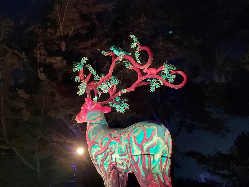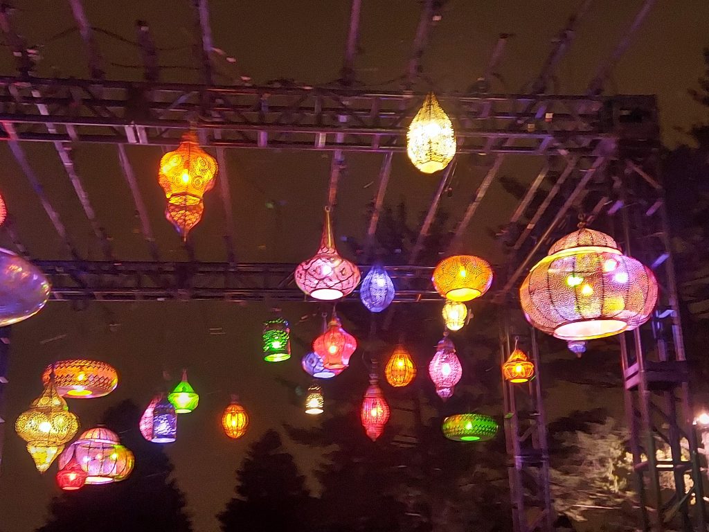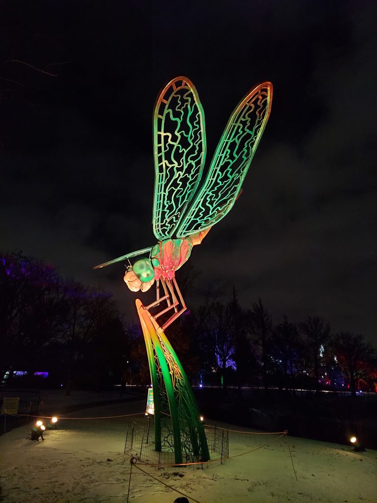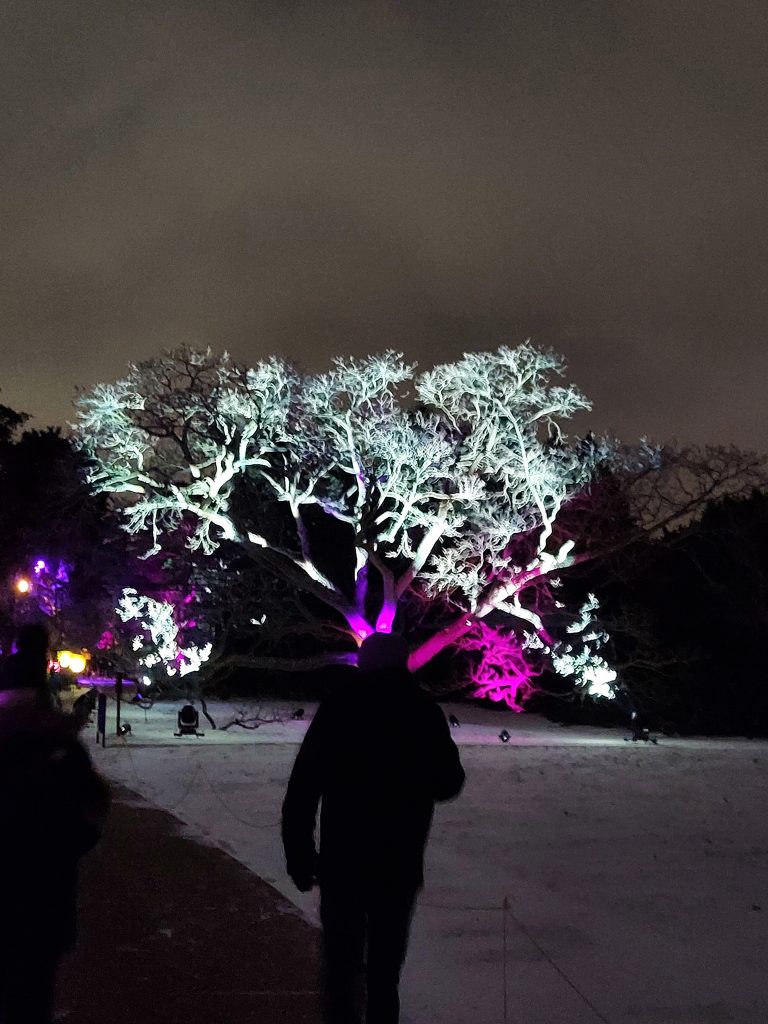 In the evening, my brother, sister-in-law and I went to Morton Arboretum’s Illumination. More than just Christmas lights, though there were plenty of those as well. It was very cold, and snowing just enough to make sparkles in the spotlights crossing the sky.