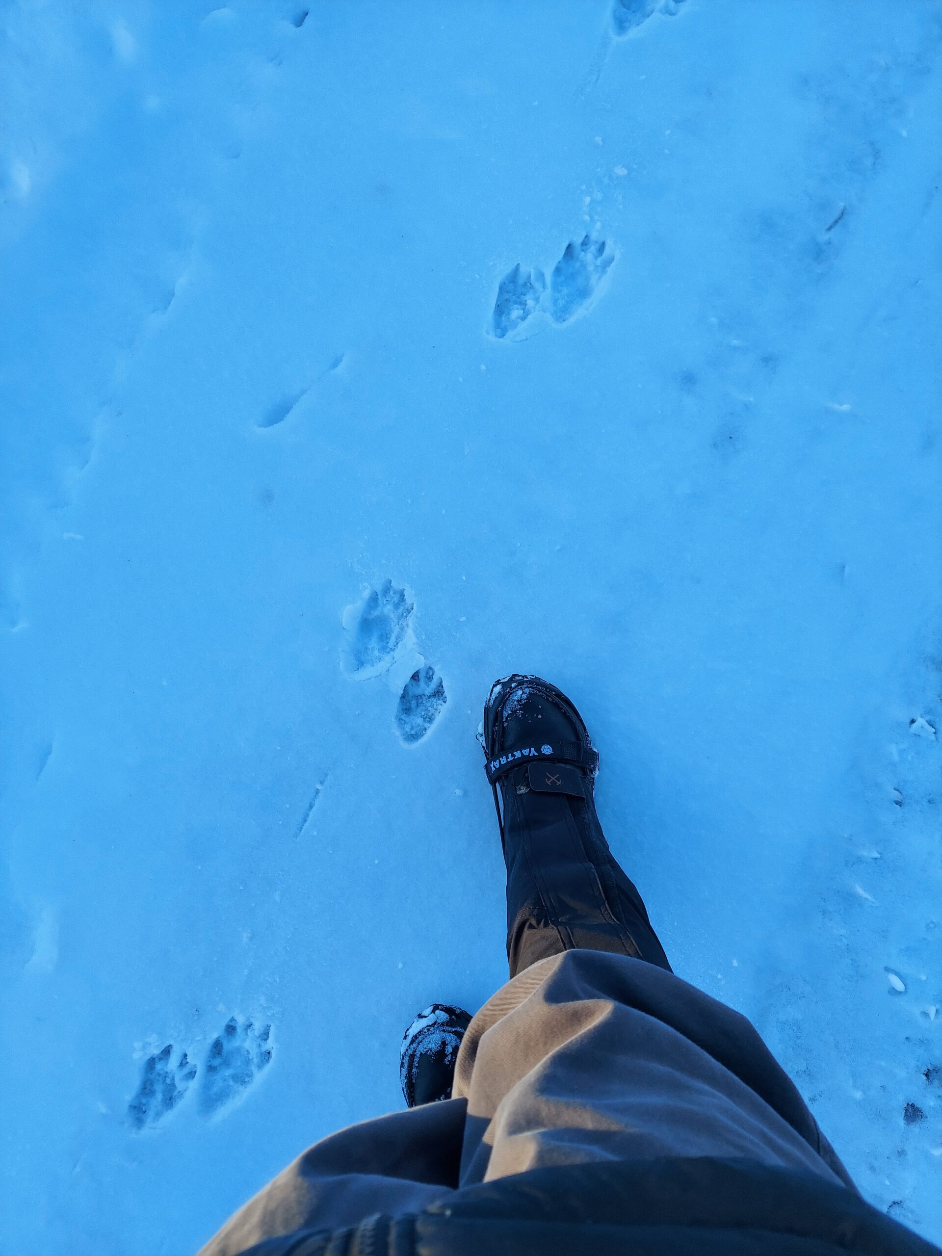 I walked a mile. Not all the way down the hill. There were kitty tracks on the light snow on my porch, and larger tracks when I walked along the road. When I looked online to try and figure out what they were, I settled on skunk. I know there’s at least one skunk around here since I saw it in my yard this fall.