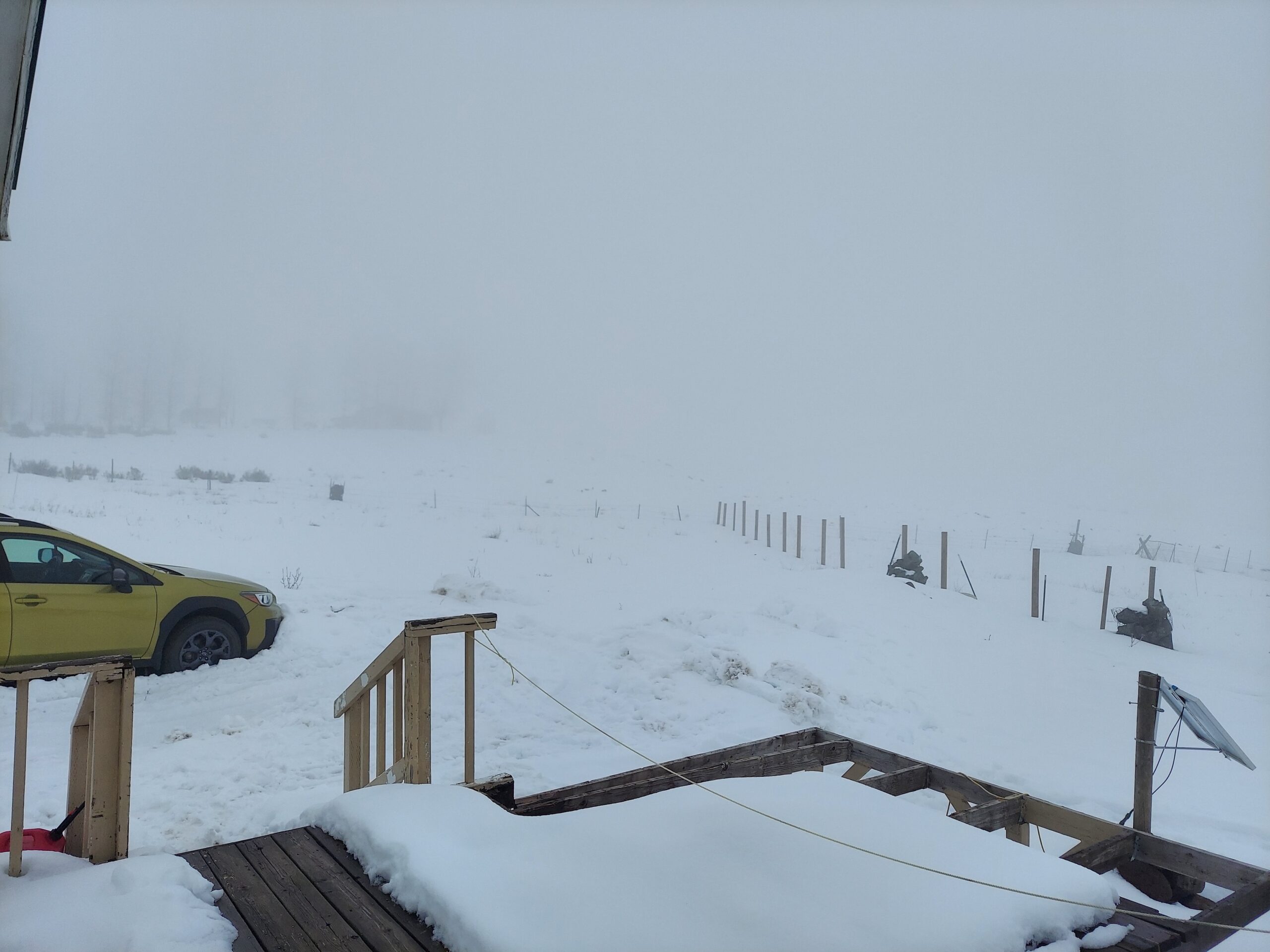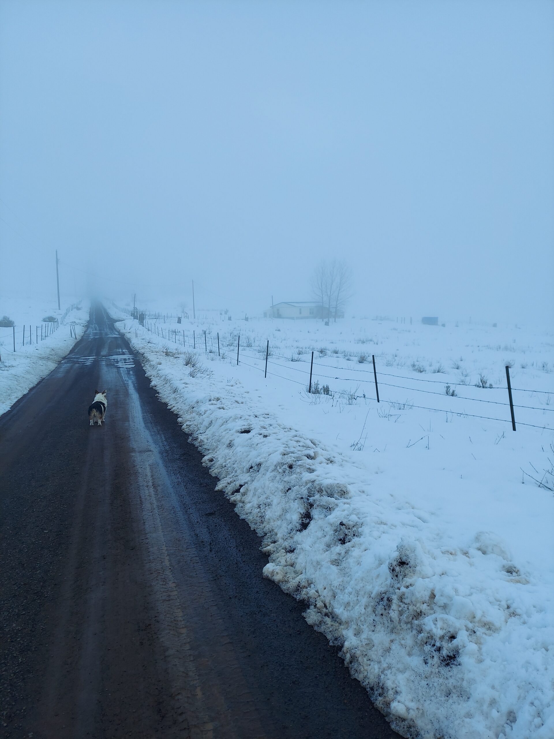 The fog was thick this morning, so I wasn’t all that visible. And I saw the usual one vehicle, but they headed out before I passed that driveway.
