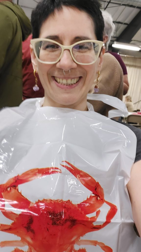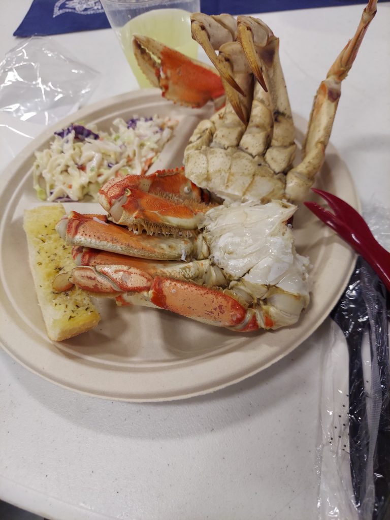 After work, I put up the laundry that I’d left in the dryer since yesterday. I decided I didn’t want to leave it in there another night, and I could afford to wait a bit to go to the crab feed. The doors opened at 5, but the food line didn’t start until 6. So I got that done before I left.
