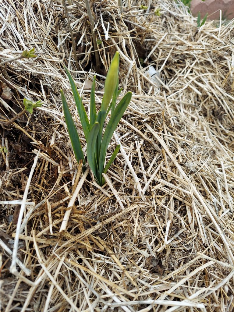 I did go for my lunchtime walk even though the mail wouldn’t have been there. I did get Saturday’s mail though, so that was good. And I’ve got a daffodil bud coming up. I’m considering taking down the straw from around the lilac, but I don’t want a sudden freeze to come up and kill everything. I really want that lilac to flower this year.
