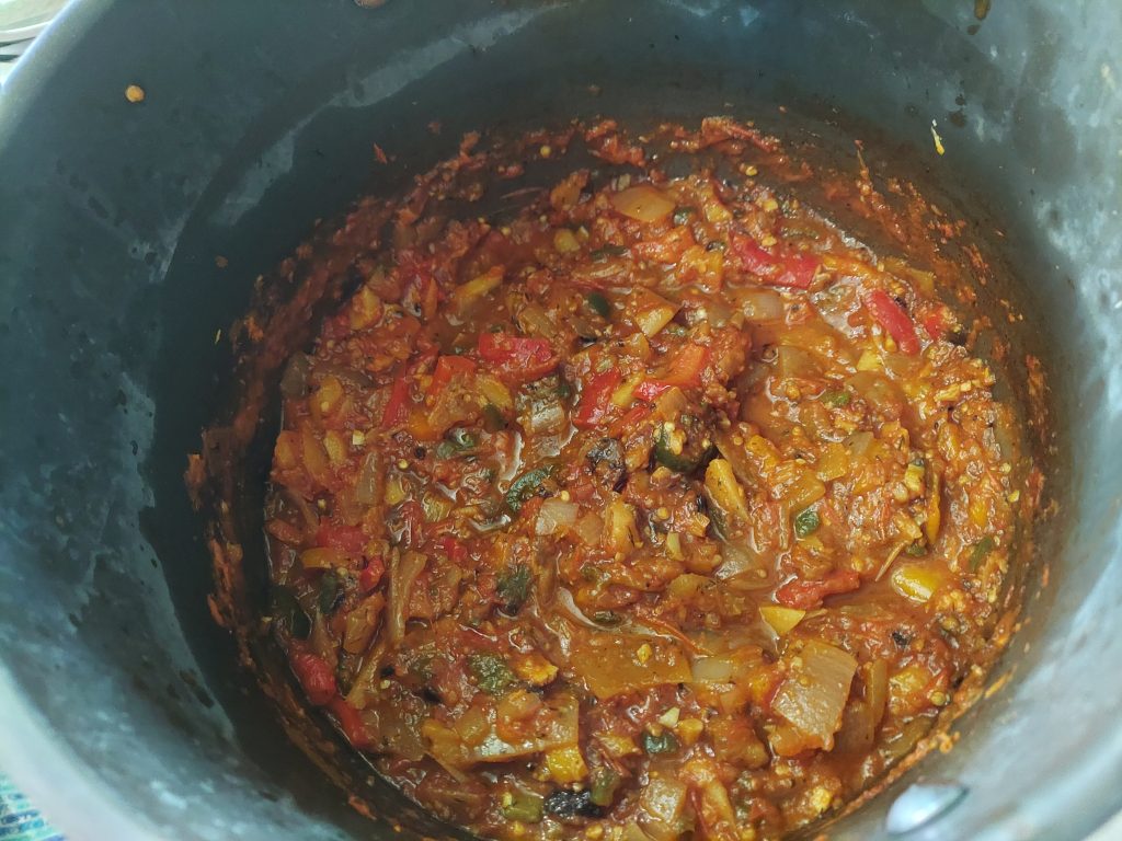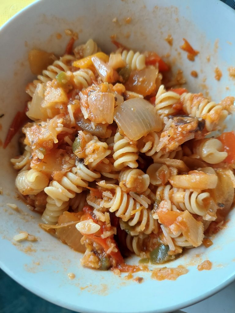 After being heated for most of the morning, the level of water in my sauce dropped far enough to satisfy me. It’s a very chunky, tomato forward sauce with an afterkiss of heat. I cooked some protein pasta, and combined that with about a cup of sauce and an ounce of shredded parmesan. It was a delightful dinner, and I’m looking forward to having more of it this week.
