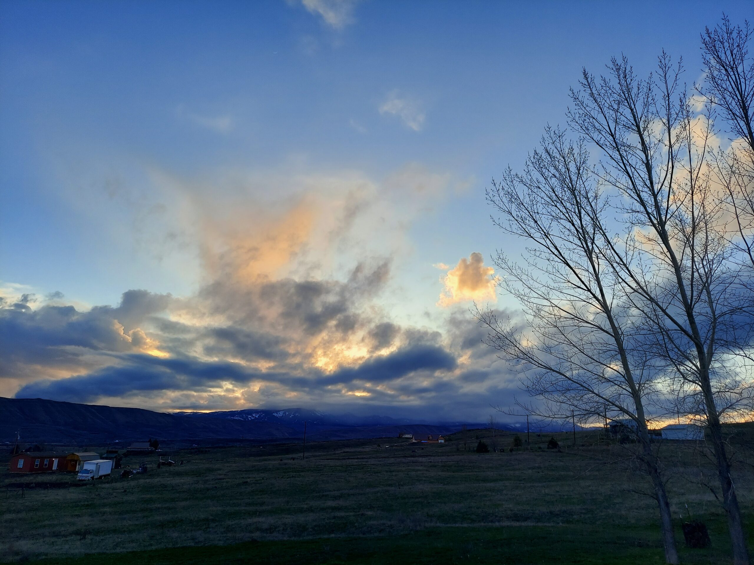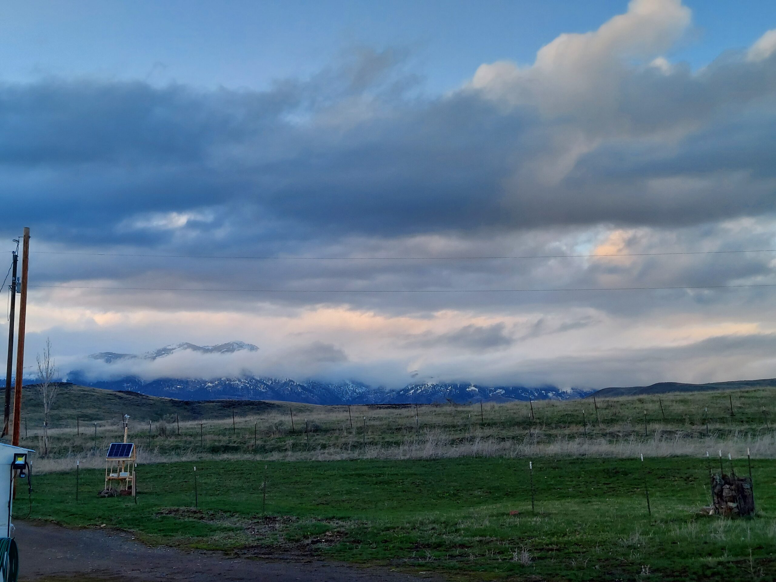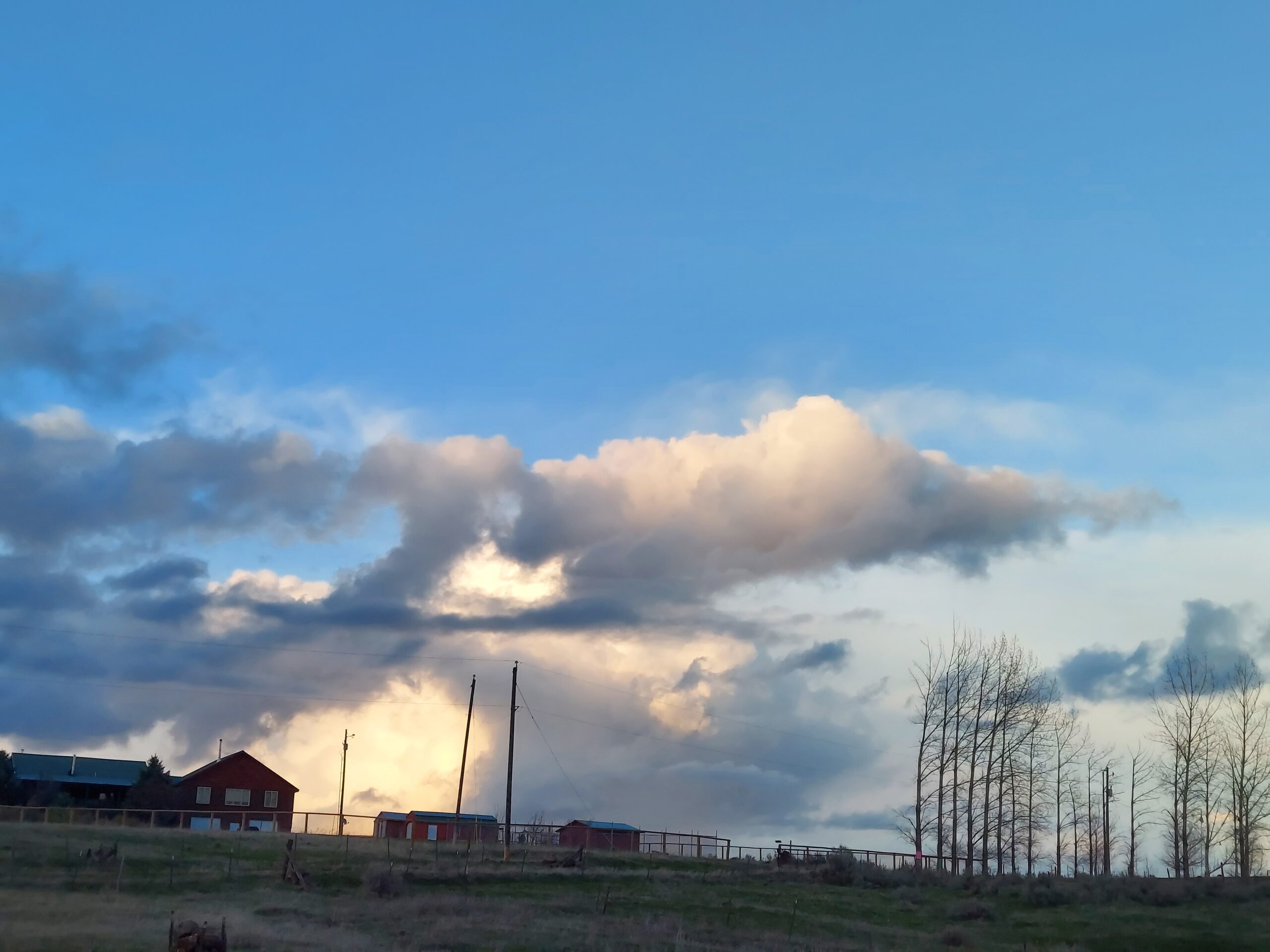 The weather has been beautiful today. Gray and cloudy to start, with storm cells bringing rain and wind and even hail, but in the evening the sky got more clear. The clouds made a painting in the sky.