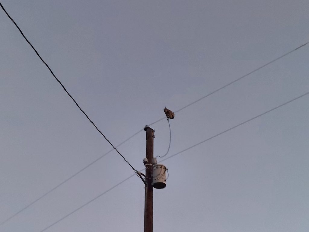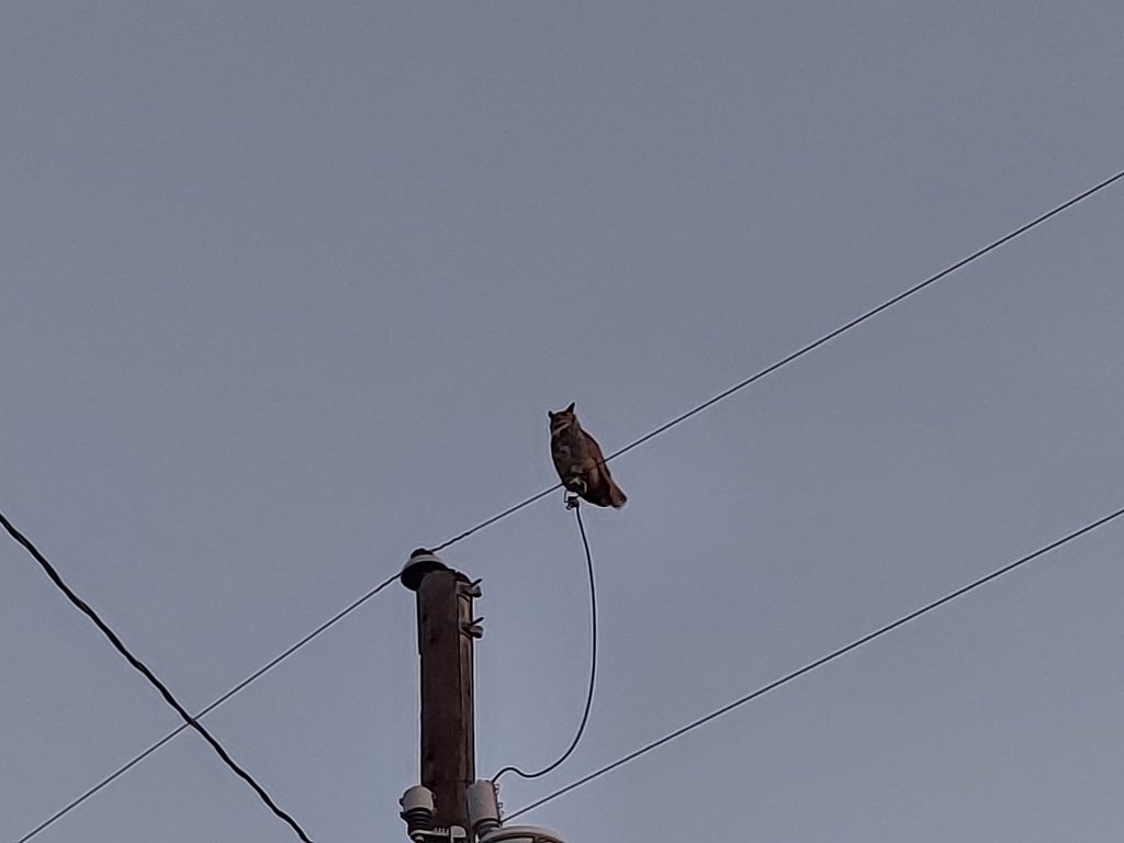 The coolest thing about this morning’s walk was that I not only heard an owl hooting, I looked up and saw the owl perched on the powerlines. I pulled my camera out and the owl politely stood and hooted while I got two pictures and a short video.