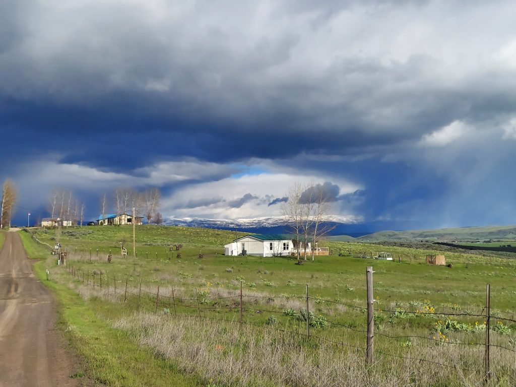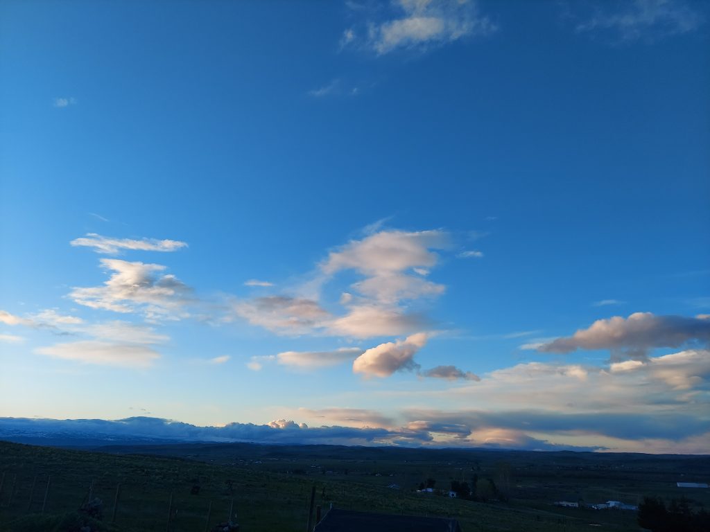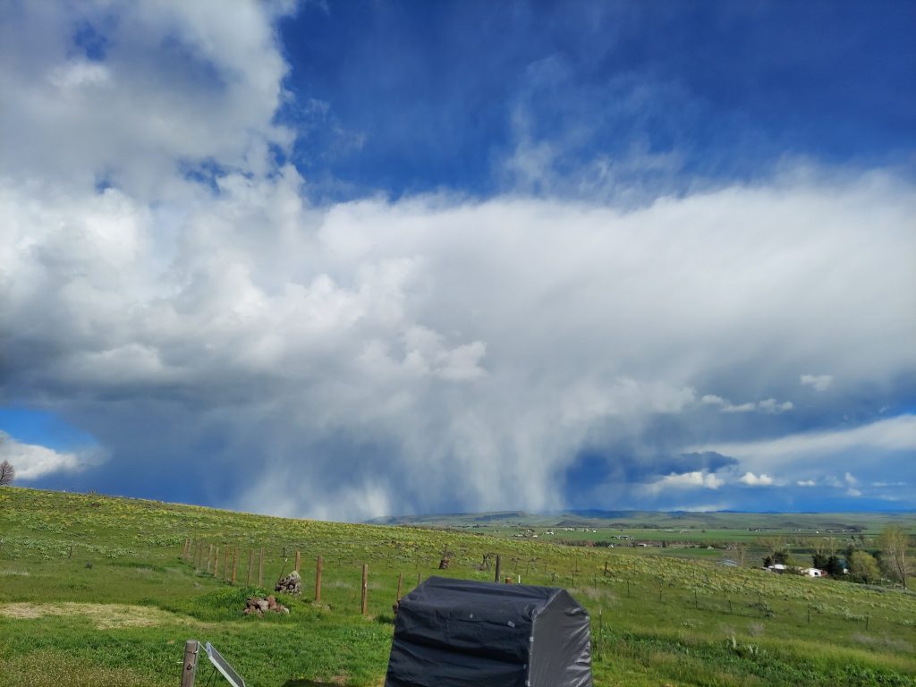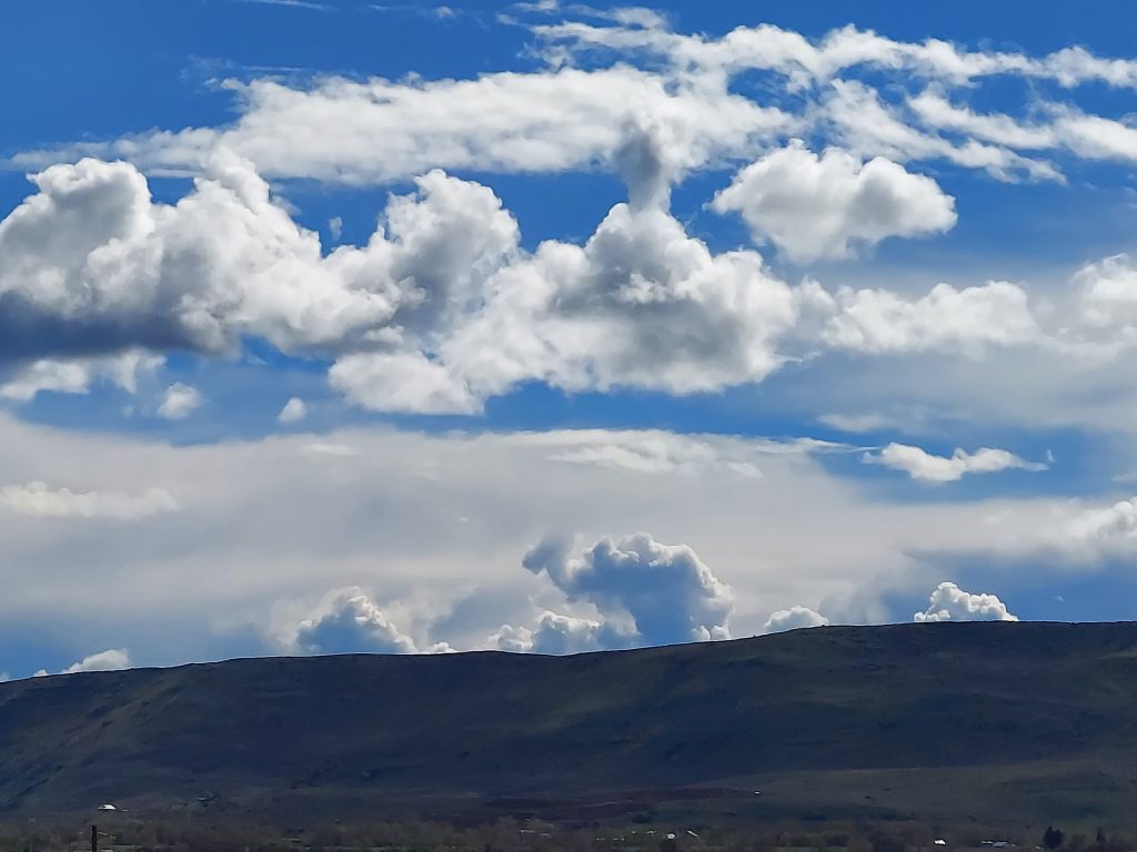 The sky has been incredible today. Partly cloudy, with scattered showers. From my hill, I can see the showers miles away in the shape of the clouds. I took a picture of some clouds that had a shape of a snail or maybe a camel lying down. I got a great shot of my house framed by snowy mountains and a spot of blue sky in a sea of clouds.