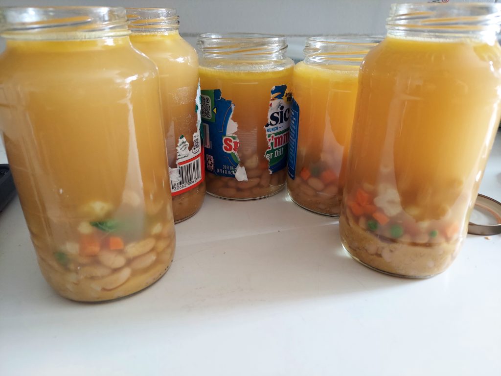 I heated water on the stove, enough for 16 ounces per serving, which may have been a bit too much in retrospect. I think next time I’ll plan for 12 ounces per, but I’ll have to see how they eat before I adjust the recipe. I mixed in various chicken flavorings to the water, plus butter. To the jars I added some drained and rinsed great white northern beans, some frozen veggies, and partially cooked protein pasta.