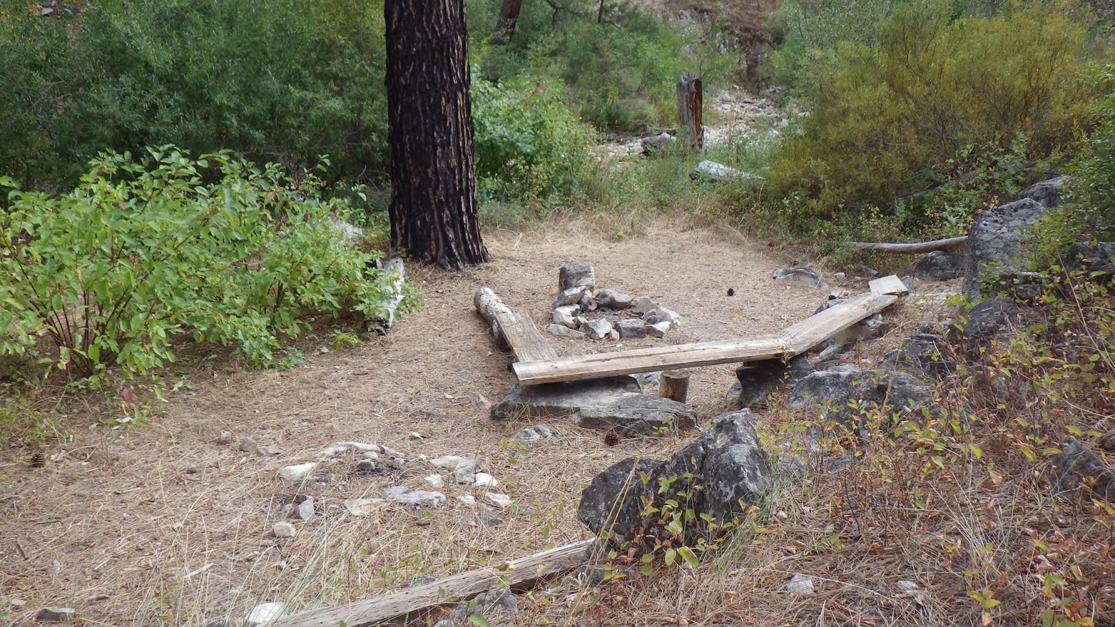 | And here’s the campsite – with a new fire ring since last year. It’s a good thing we’re not lighting a fire, because the best place for the tent is right next to that new ring. |