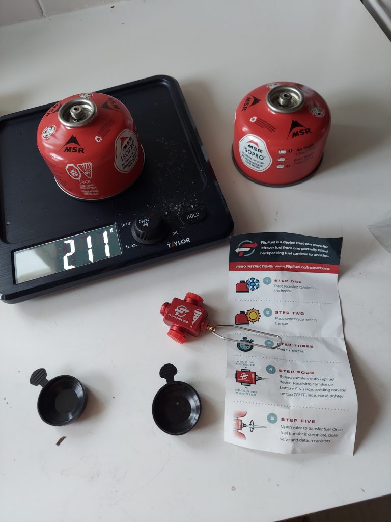 When I got to the cook kit in my packing, I remembered that I have a new tool called a FlipFuel. Instead of taking out two partially full fuel canisters, or continually buying new full ones, I can move fuel from one canister to another. Ambrose bought it and I think he used it once, but I hadn’t used it yet. It worked perfectly, and I don’t have to take two canister out because now I have a full one.