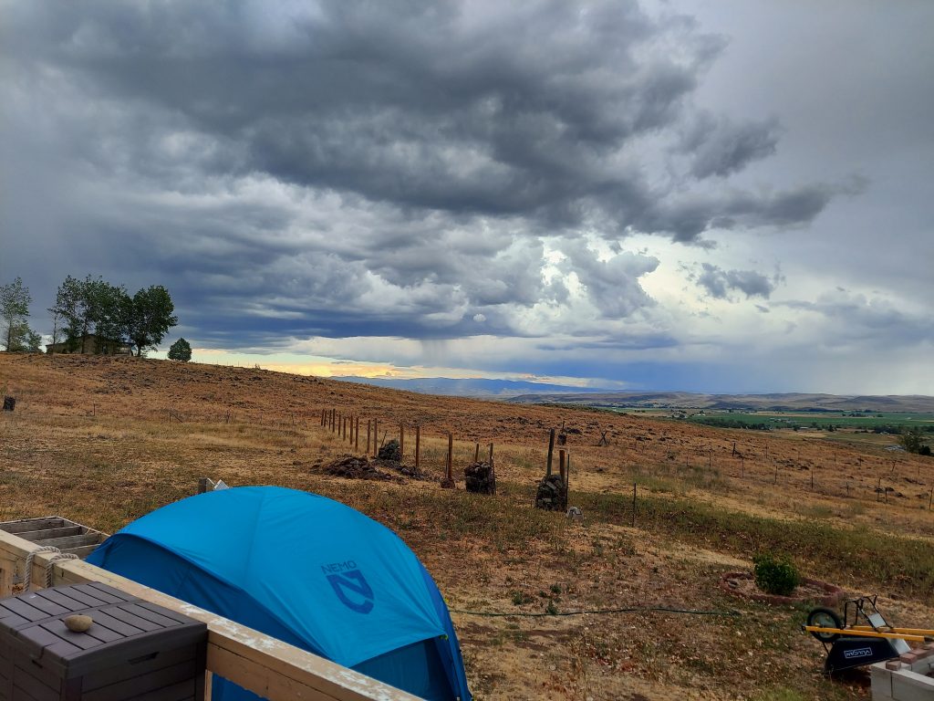 Well, sleeping outside on a work night was fine. I didn’t end up getting out of bed with any more or less alacrity than if I were sleeping inside. There was a bit of rain last night and this morning, so it’s good that I left the rainfly up. And there was more rain today, so I’m glad I left it in place today.