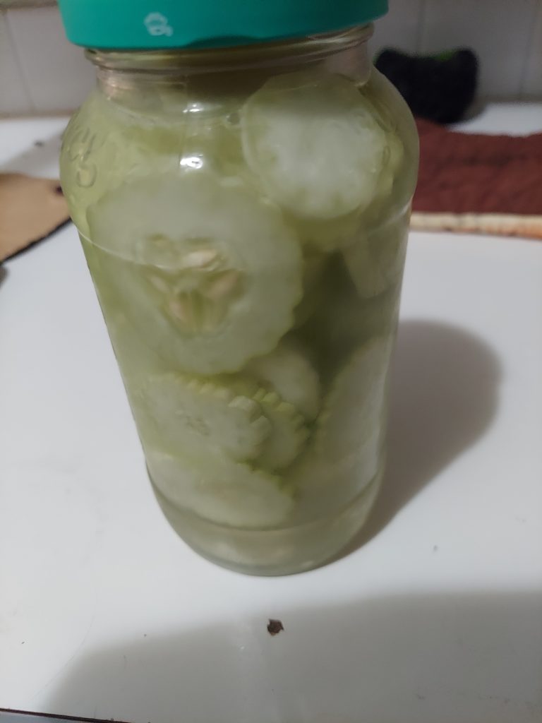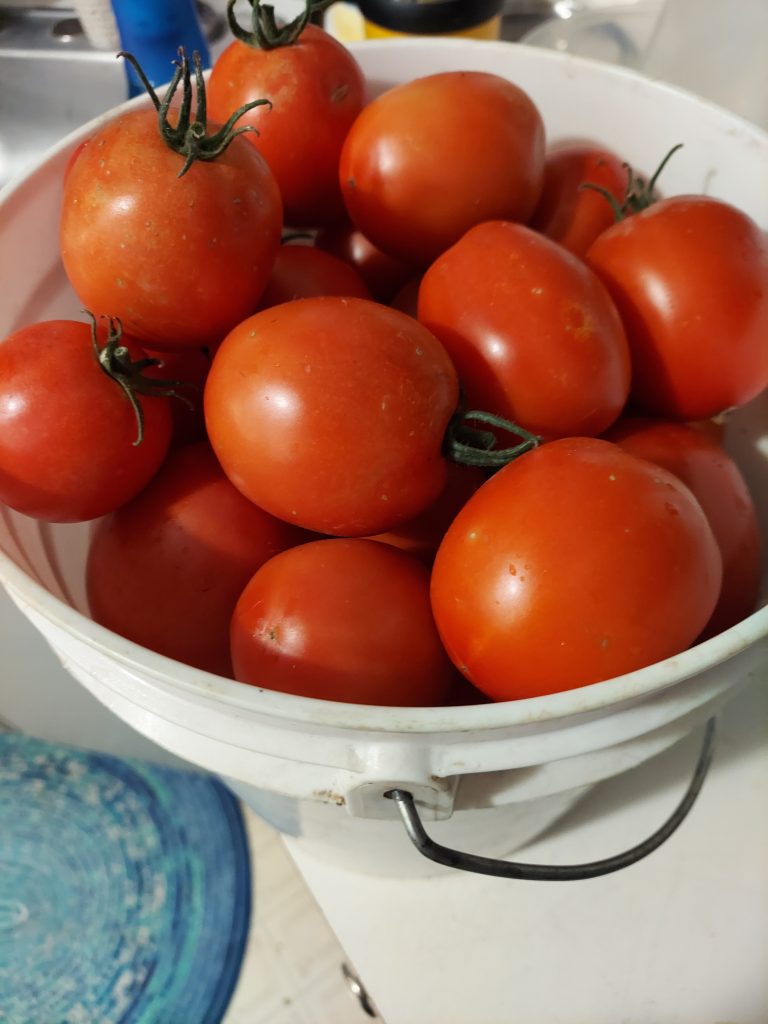 My friend who gave me the tomatoes had more for me today at our sectional rehearsal for choir. The sectional rehearsals are for going through parts, so the sopranos and the altos meet together and the tenors and basses meet on another day. I now have a big bucket of tomatoes. I’m goin to freeze some so they don’t go to waste. They are so delicious. I also told her about making the quick pickles with those cucumbers and texted her the recipe. I transferred mine from the rectangular glass container into the jars from the pasta sauce I made after I ran them through the dishwasher.