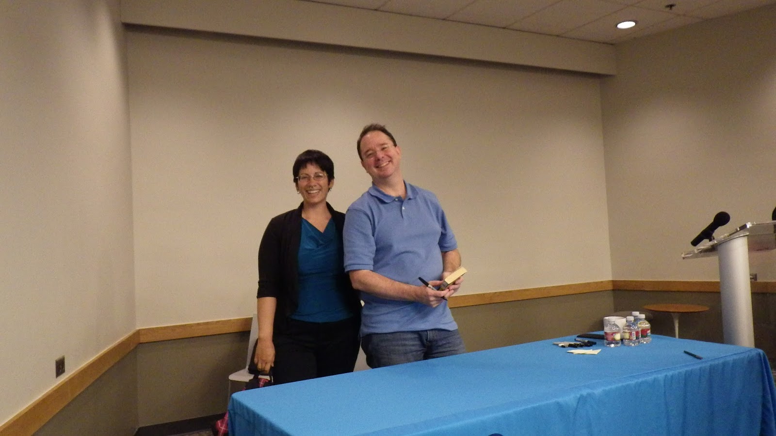 My husband and I settled in to wait, observing the room filling, noticing that Scalzi was chatting with the event organizers in the rear, and giggling a bit that the couple behind us did not recognize him, despite having walked right by him, close enough, because of the dimensions of the entrance, to have touched him in passing.