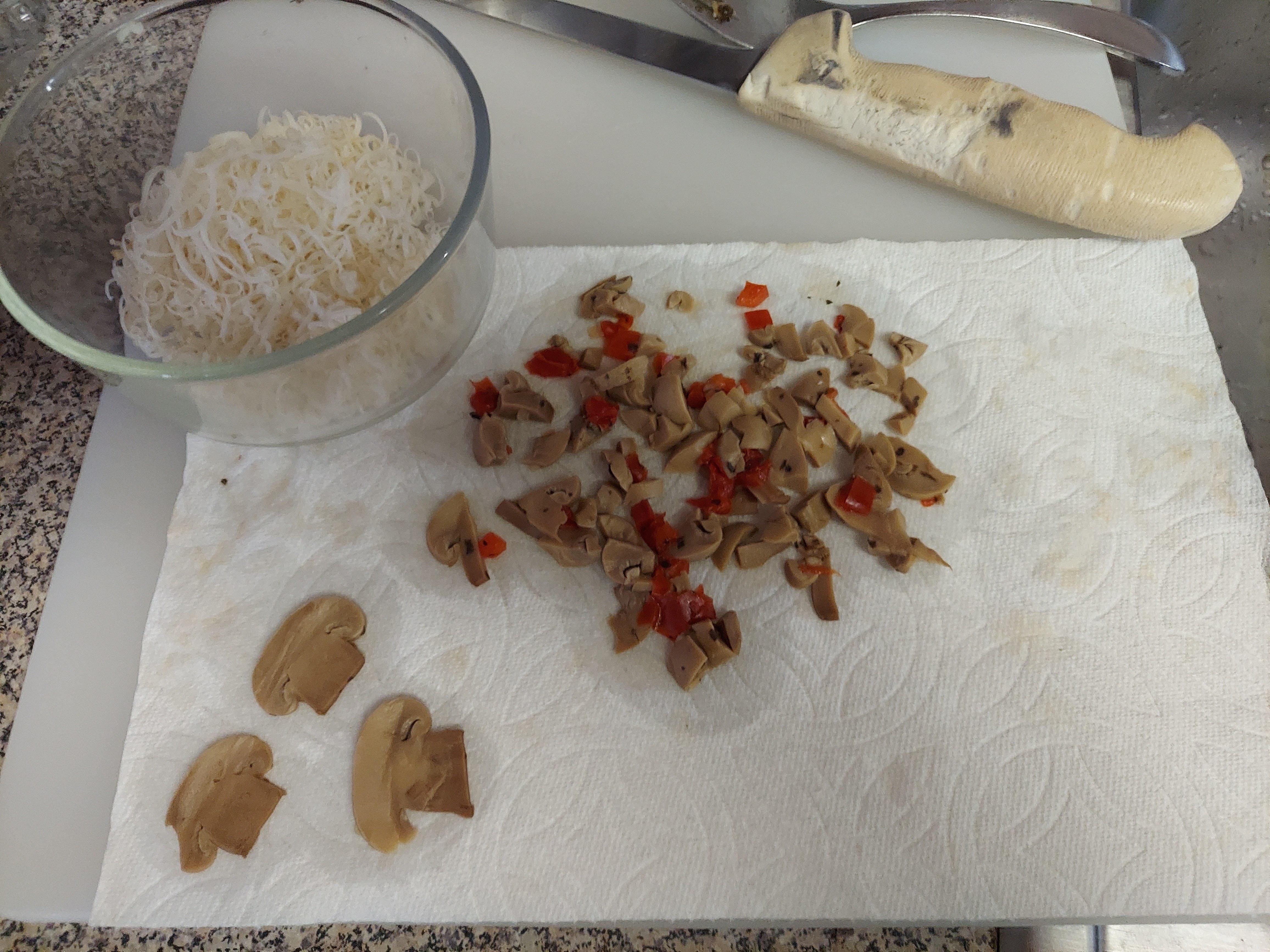 My idea was to make a mushroom pizza omelet, and I started by dicing up some marinated mushrooms – reserving a few slices for the garnish. I also shredded some of the cheese, because my style of omelet cooking requires everything is prepped beforehand. Ambrose suggested I let the mushrooms sit on paper towels so that they wouldn’t be soggy and ruin the omelet.