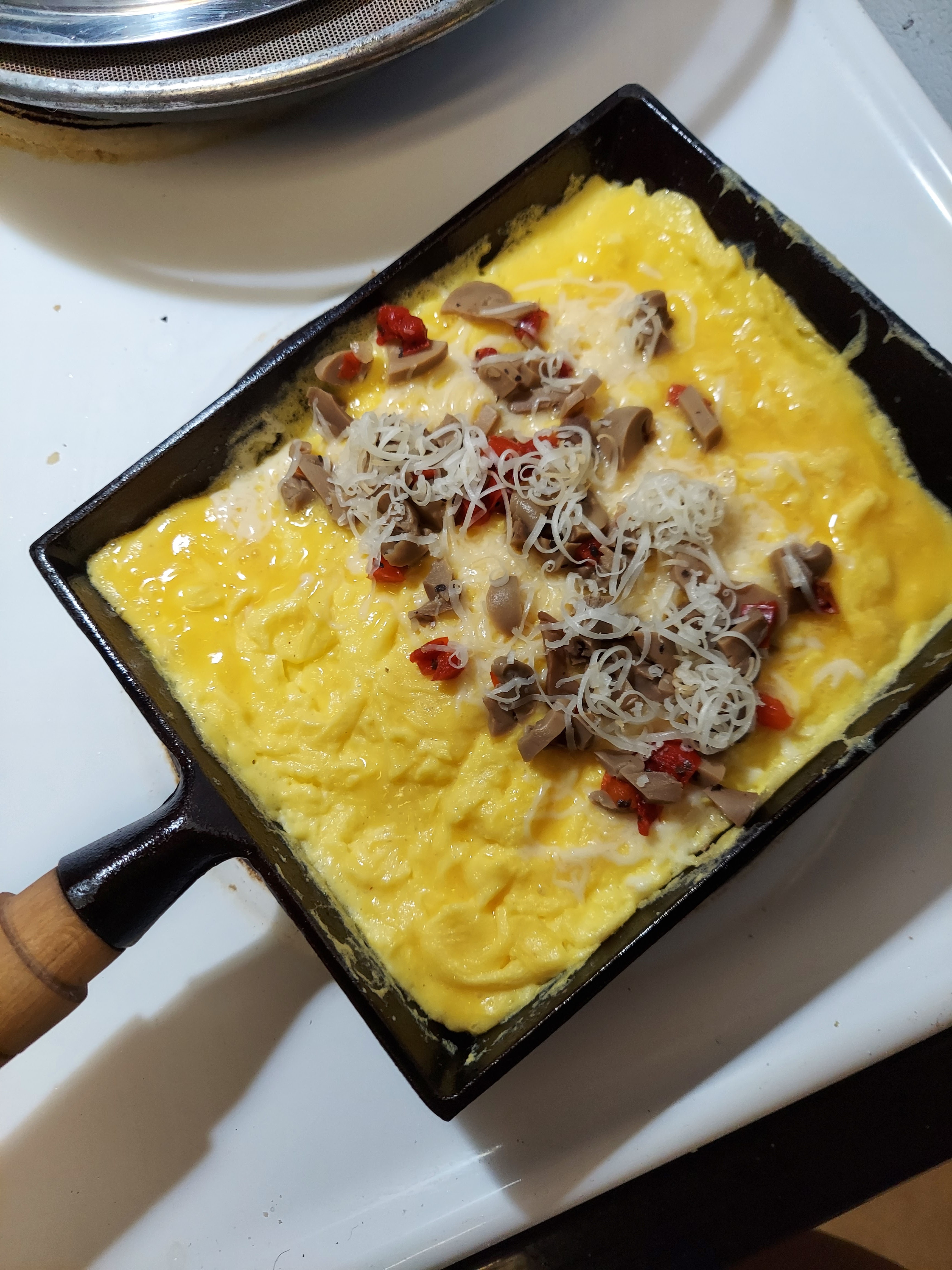 I prep the eggs by giving them a whirl in the Ninja blender with a dash of salt and potassium salt. The omelet pan gets a pat of butter and medium heat until it melts. Then, and I only discovered this recently, when I’m ready to start cooking, raise the temp to high and wait about 20 seconds – then add the eggs. Allowing the pan more time to heat really impacts how much egg ends up sticking in the pan after.