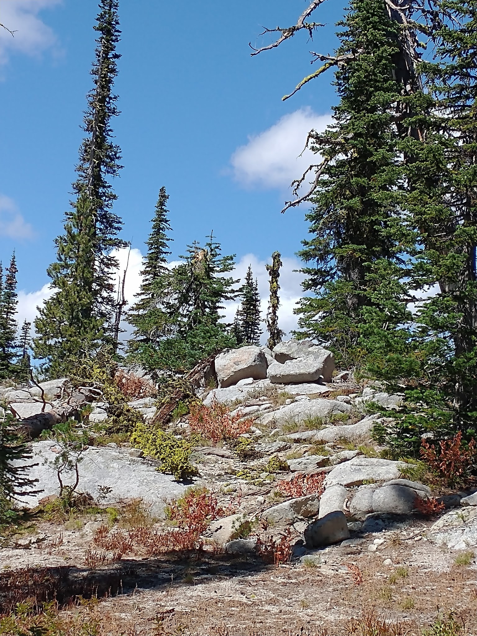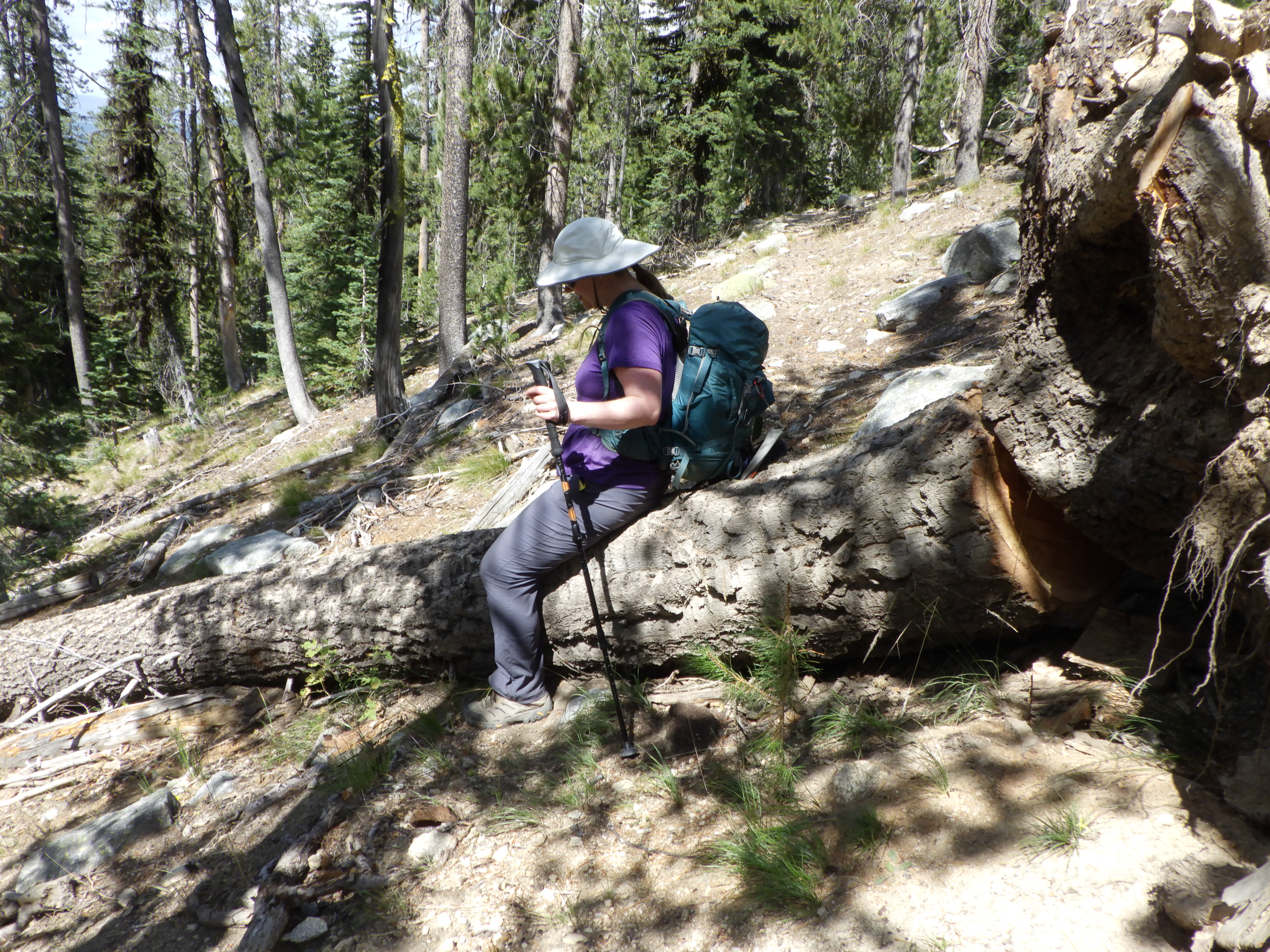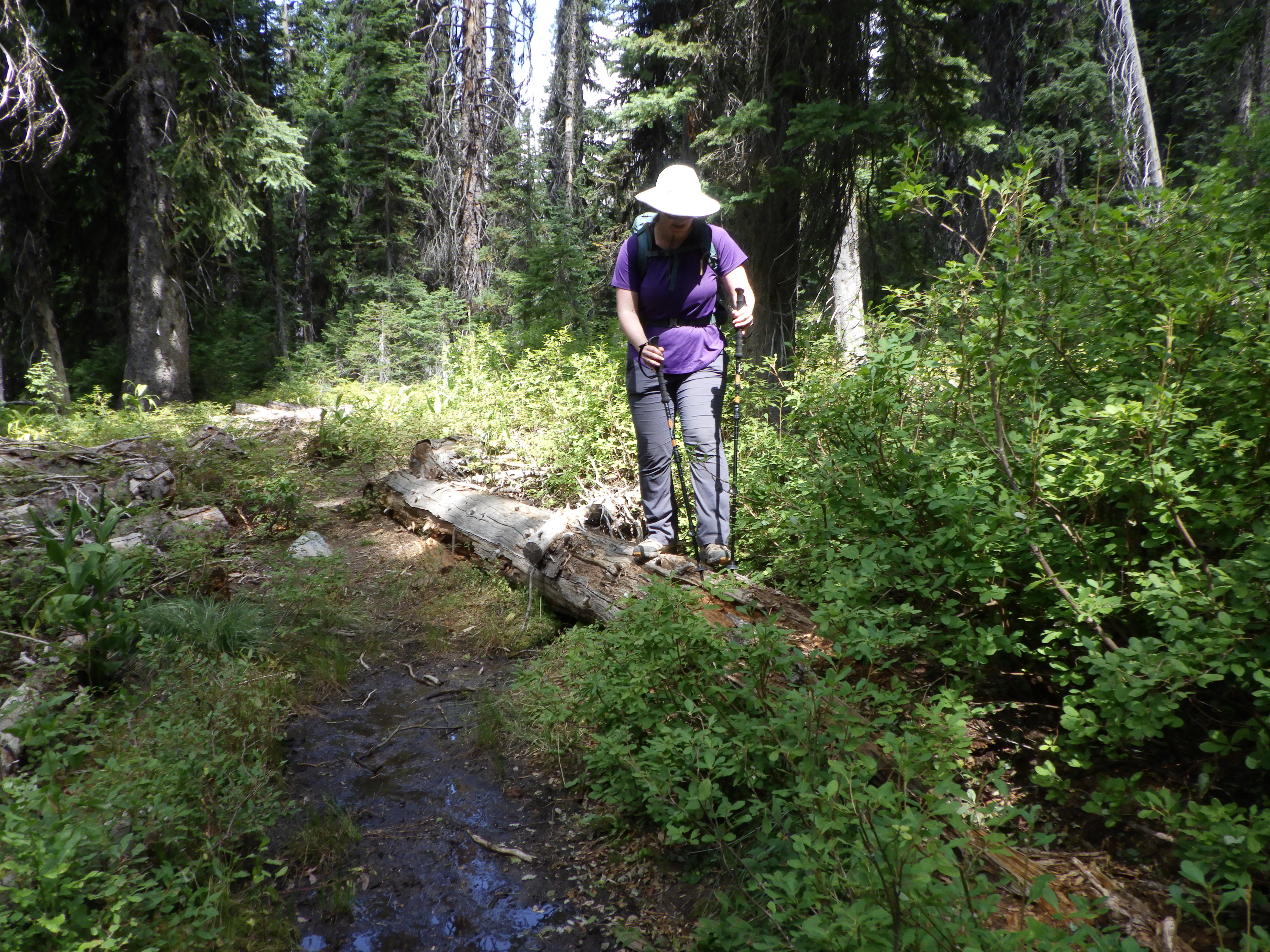 After the crossing, the trail climbs. A lot. It’s got a bit of variety, but mostly it’s up. There were switchbacks and ramps and a few large downed trees that required upward go arounds. I saw quite a few huckleberry bushes, but we were far too late in the season to see any berries. We stopped every 20 minutes or so for a brief break, and I made sure to give us bigger breaks every now and again as well.