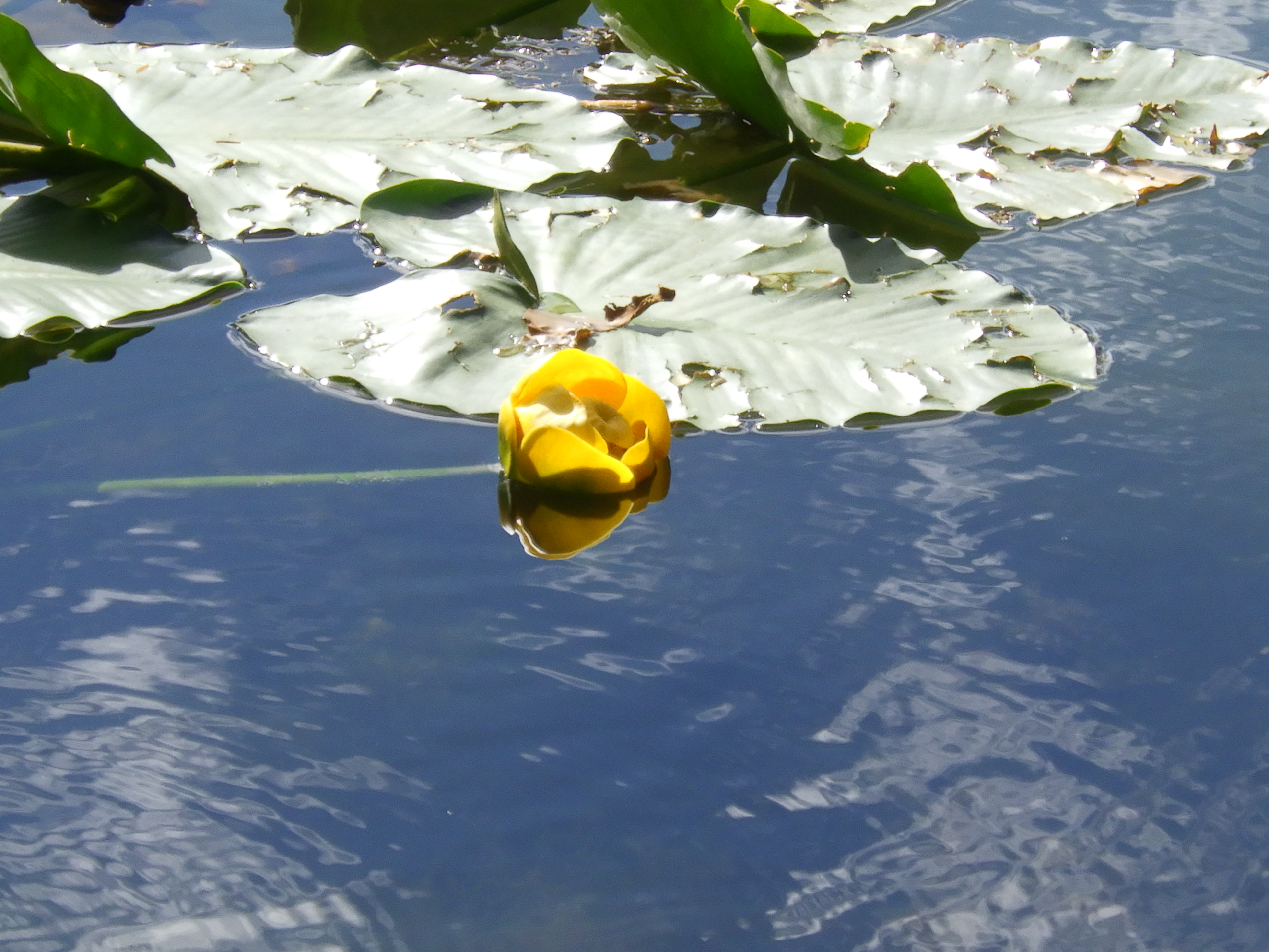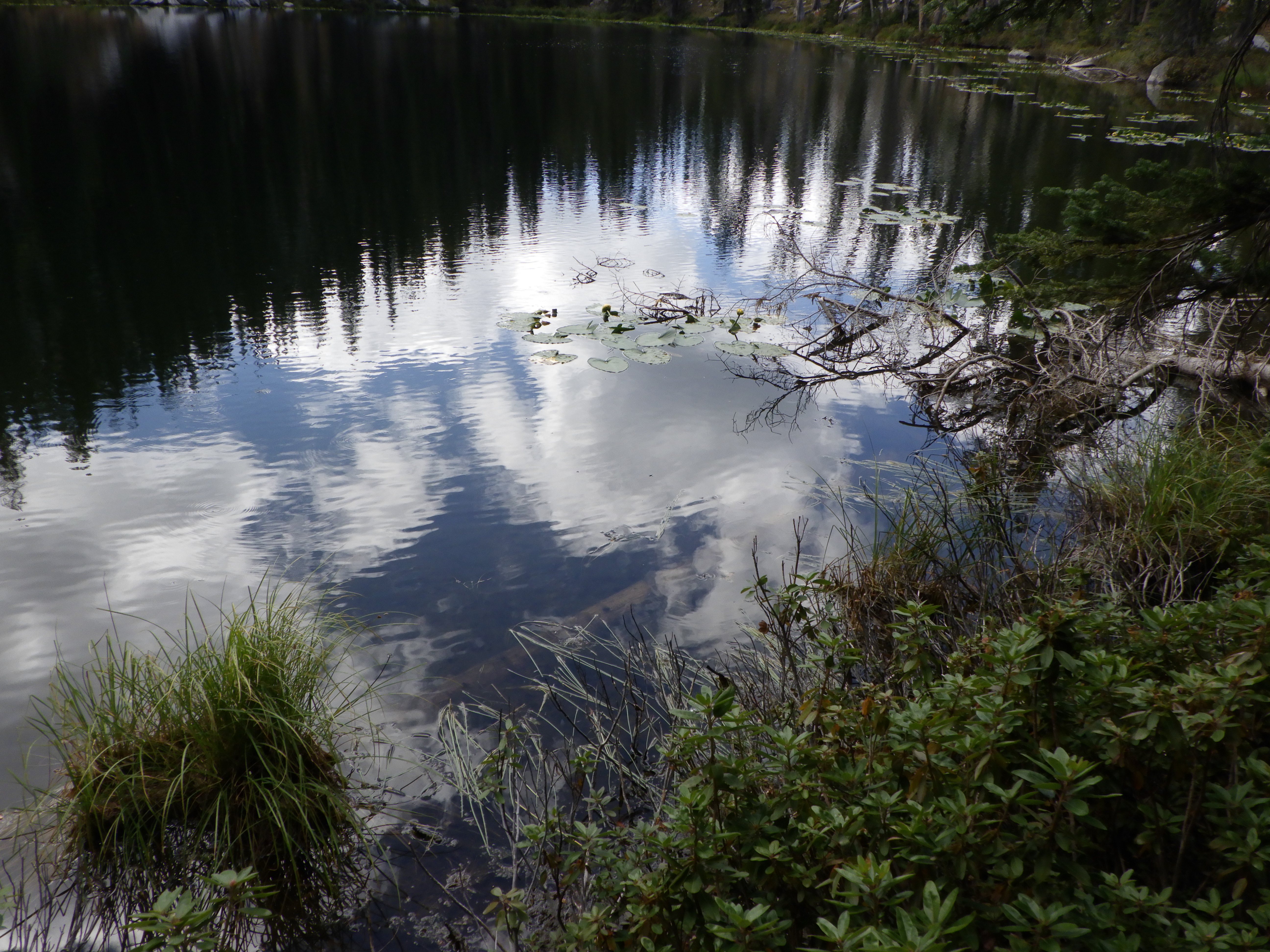 Once we had rested sufficiently, we needed to get water. The water right by the campsite was coming up scuzzy, full of debris and gunk. So we went on a little safari to find a better place to draw from. We started by going to the lake’s inlet, but the bank there was just muddy, though the view was very pretty with lots of water lilies in bloom.