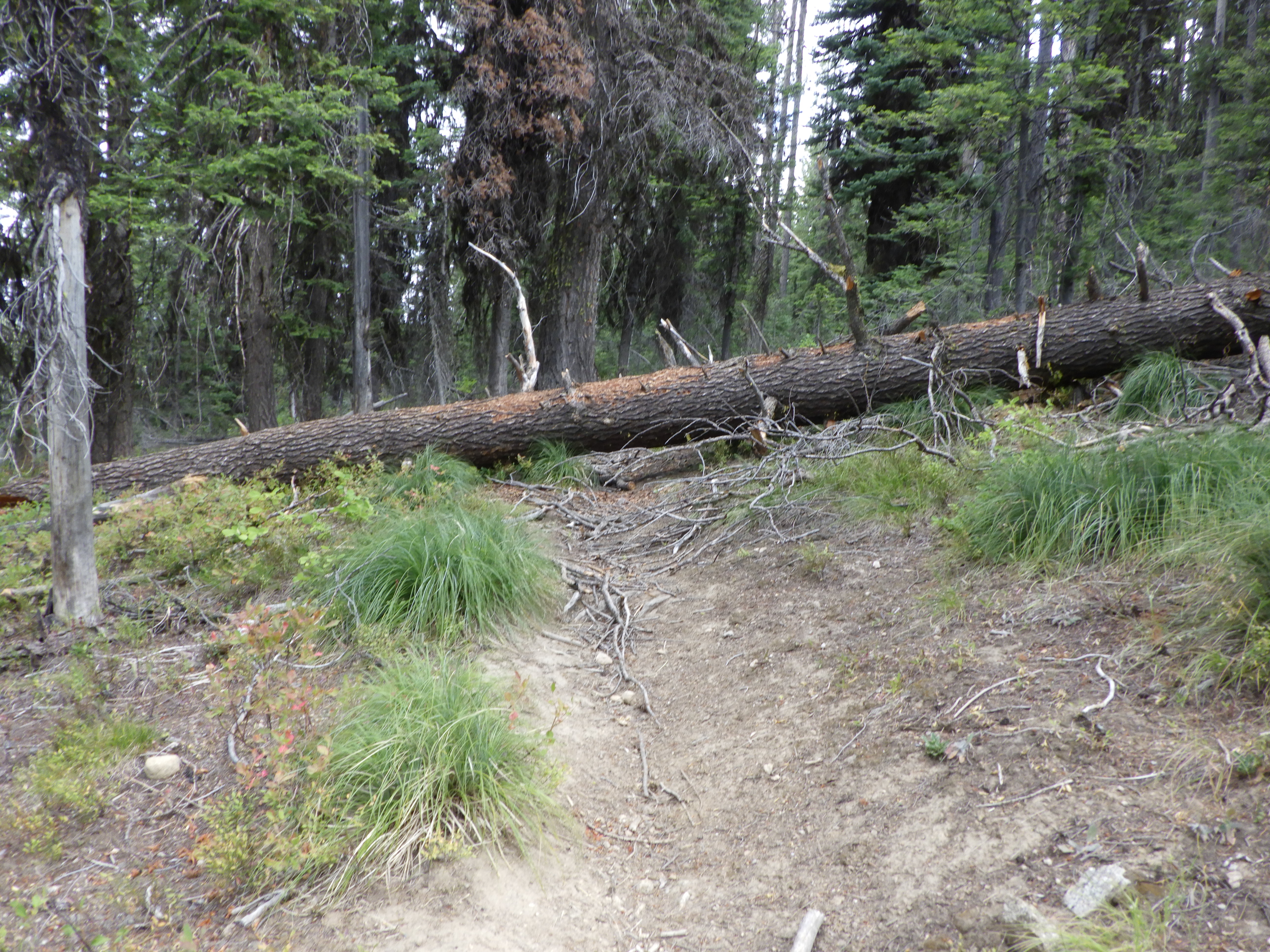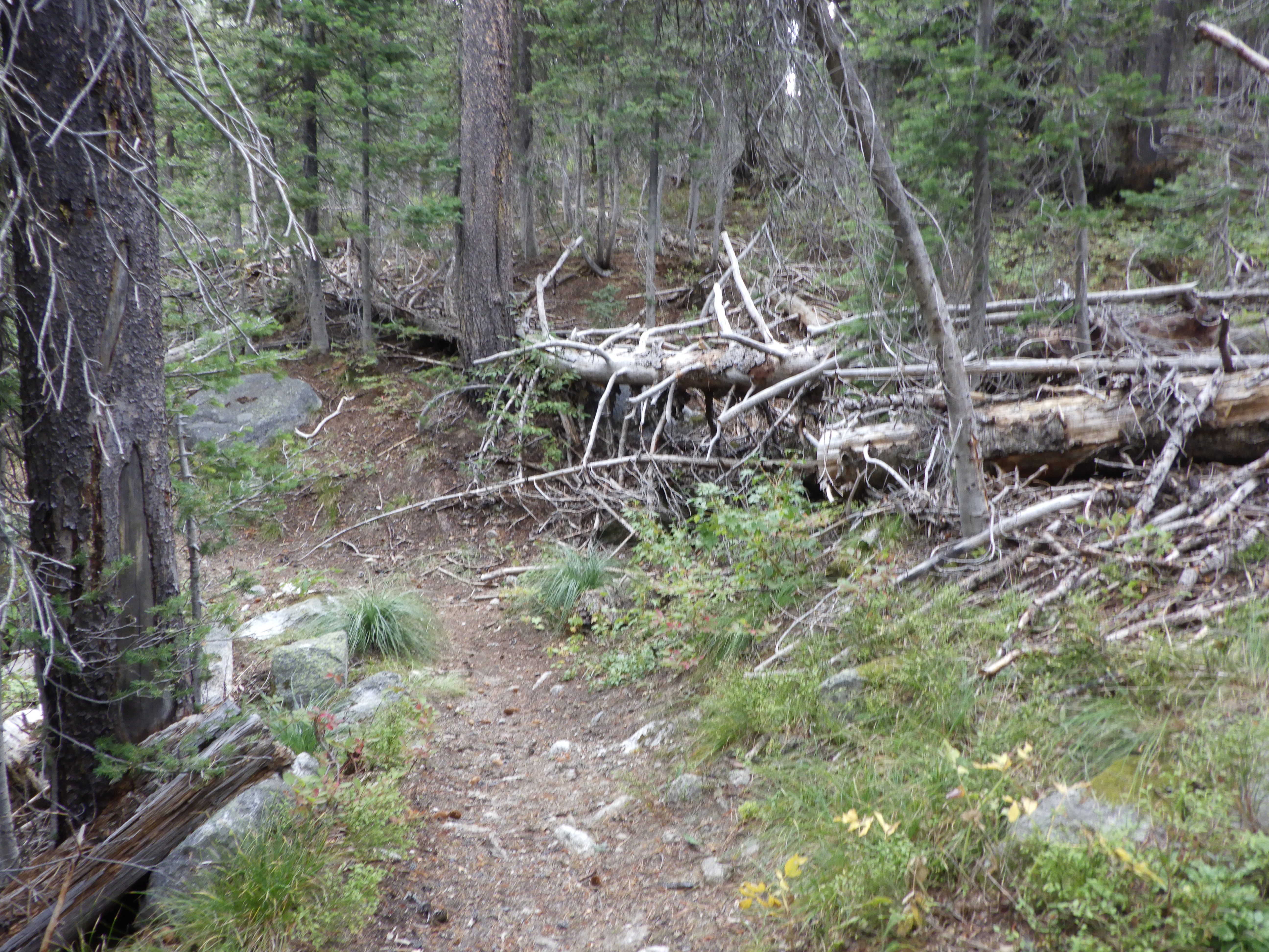 Eventually, we made our way all the way to the infamous “no trail” sign. Here, we took one of those longer breaks and had a talk about our route. The original plan had been to go to Blackmare Lake, but based on our hike so far, I didn’t think either of us was in the shape to make it. It isn’t a long hike to Blackmare along the no trail, but it isn’t really a trail either. There are route markers, and I have been there several times, but I haven’t been there in a couple years, so I didn’t know exactly how difficult it was going to be. But I did know that unless there had been some maintenance right by the lake itself, we would be facing a very difficult climb around fallen trees right at the end of the hike. And that’s after a 500 foot climb in a quarter mile and several other precarious climbs, both up and down.