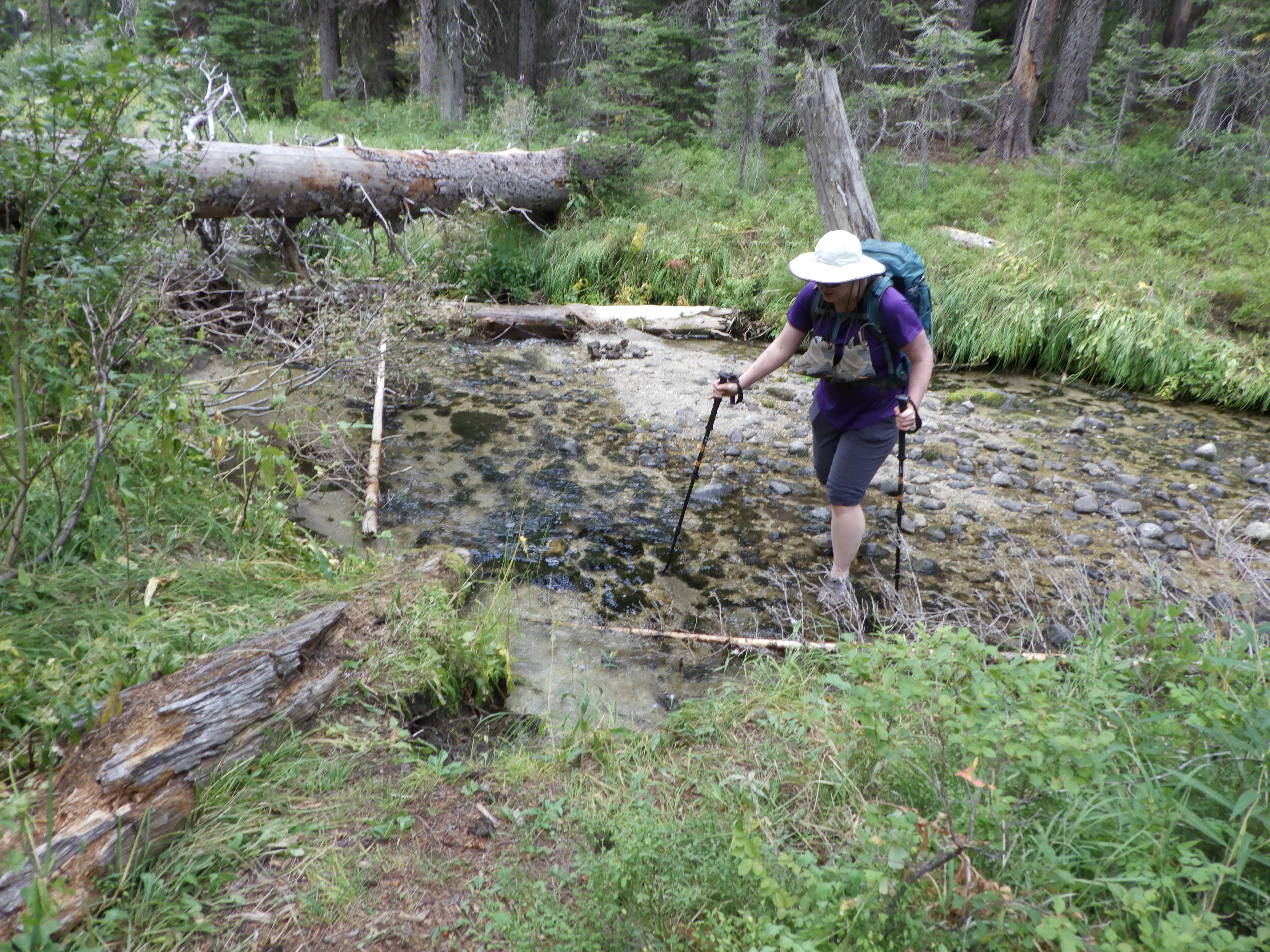 I planted both trekking poles in the far bank. I reached out my right foot and tried to find a solid place from which to launch myself across the gap. Slip, slide, there. Right there. Okay!