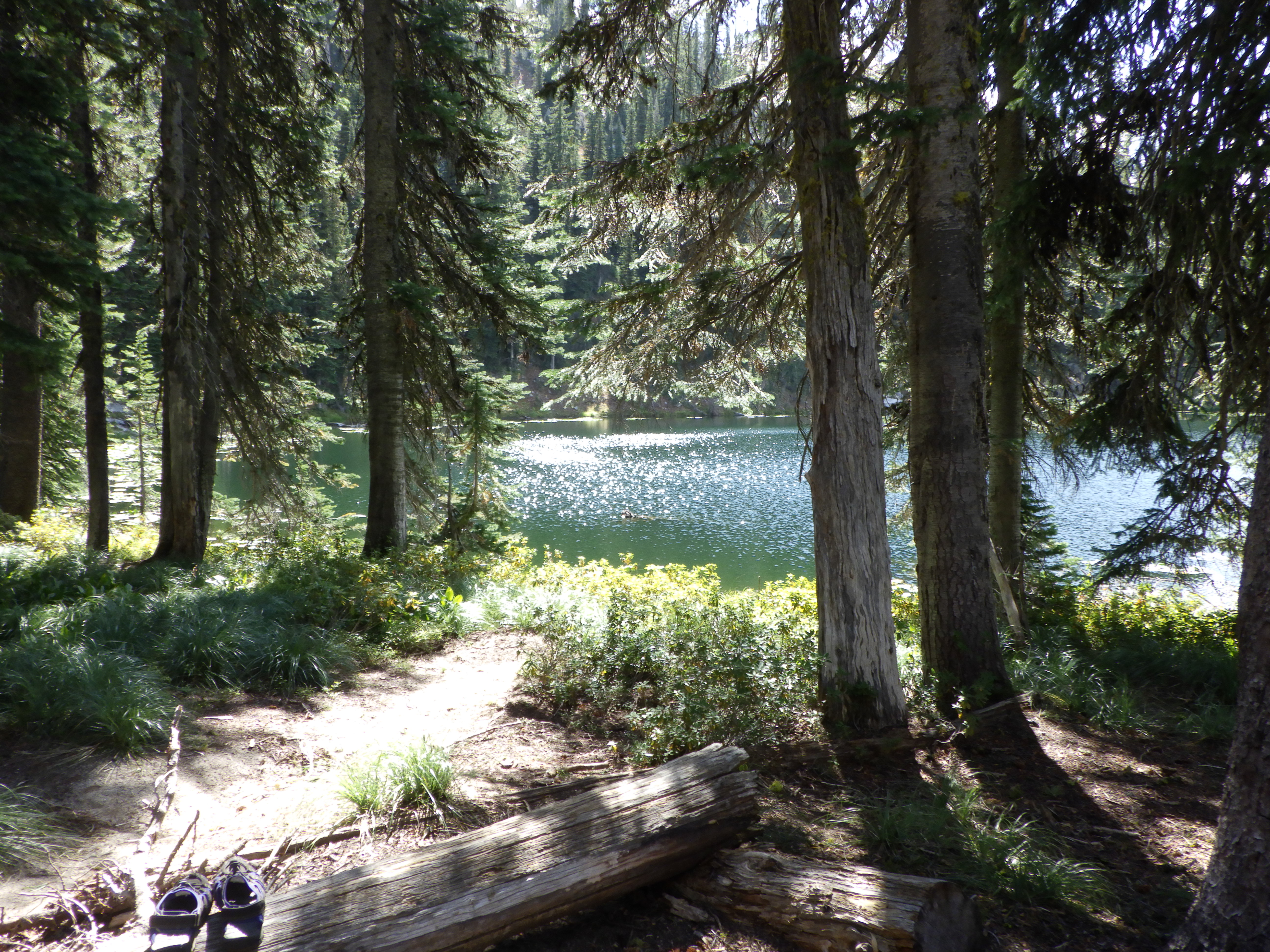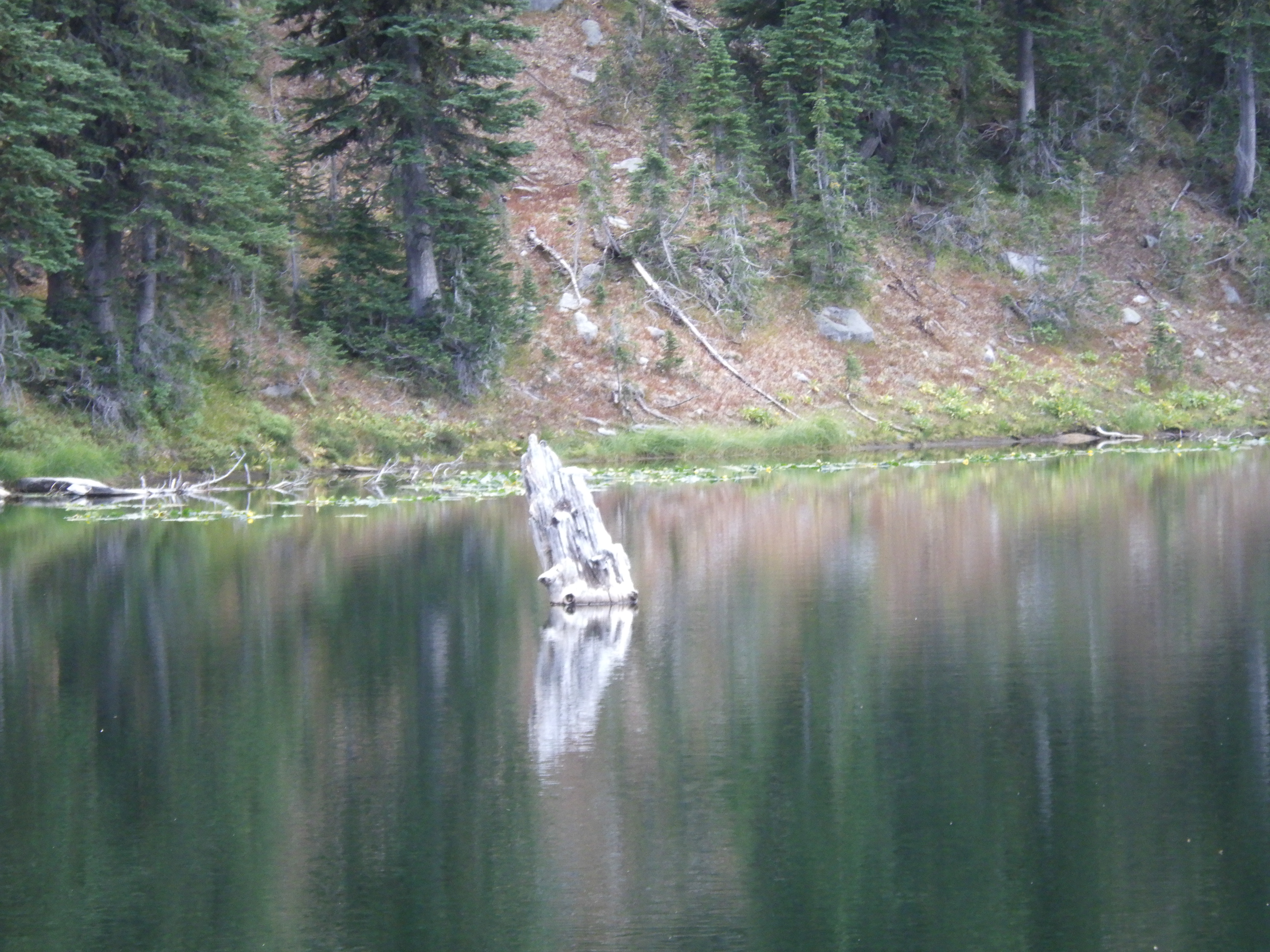 First order of business: take a break! We were both pretty tired and overheated from the hike up, so first we just collapsed around the fire ring and recovered. The sun was out and made sparkles on the lake, especially when the wind was blowing just so. There were lily pads in bloom around the edges of the lake, dragonflies chasing each other – we even saw some conjoined dragonflies mating on the wing. Stump Lake is a magical place, full of beauty, and oh-so-quiet.