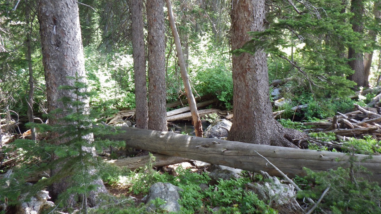 I wasn’t more than 10 yards from camp before I had to answer that call of nature. Which was actually a relief. I continued around the lake, confirming the report from the guy that what looked from afar like grassy meadow was actually grassy marsh. Not a good place to camp. I went through the grasses into what Ambrose called the dark wood, having seen it only from across the water. It wasn’t all that dark. But it wasn’t bright either. Trees and grasses, mud and flowers, surrounded by rock walls on one side and water on the other… and no good places for a tent.