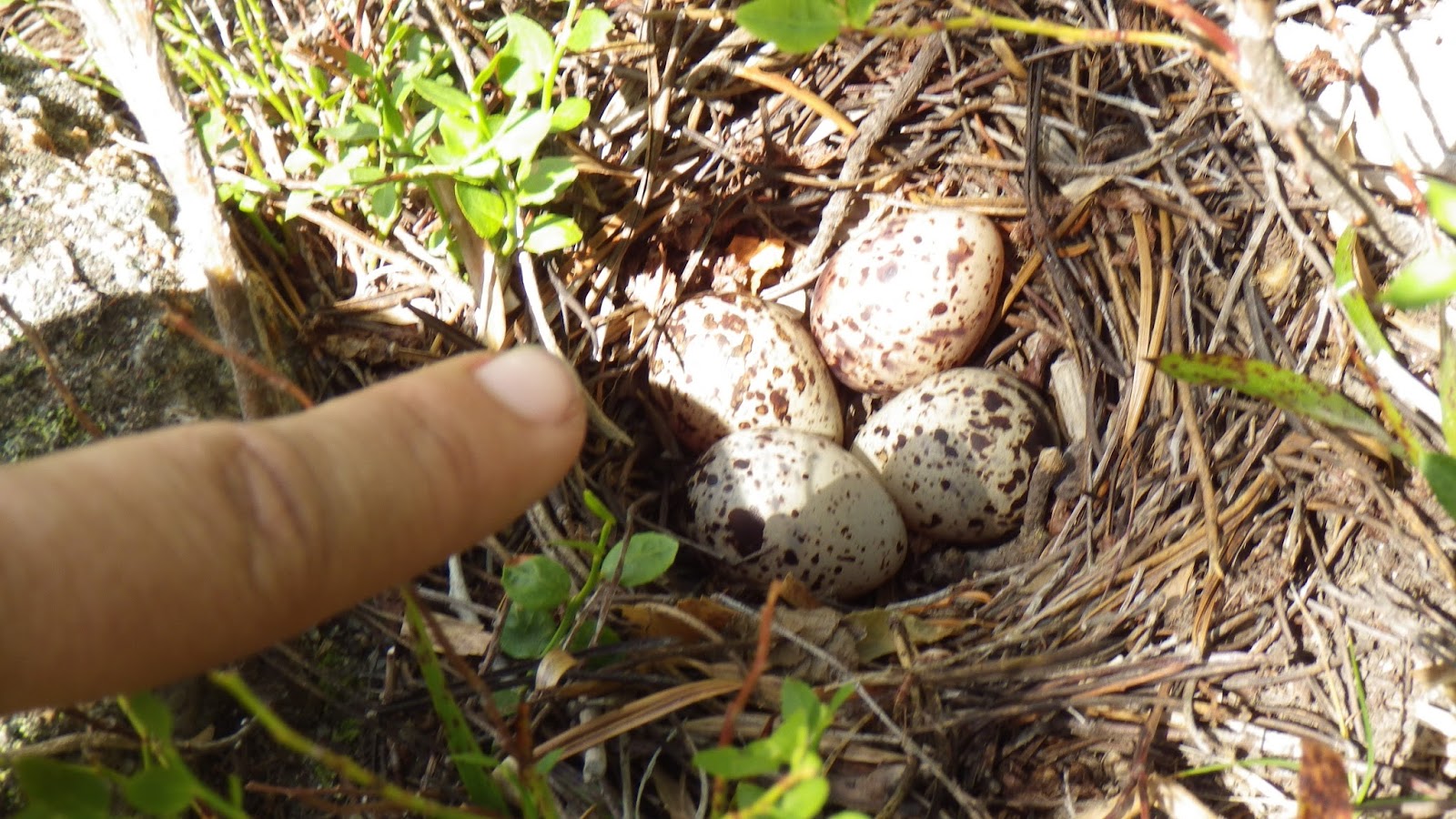 It wasn’t very far to the outlet, and I agreed with the guy’s assessment of brushy. I was extra, super glad that I’d put my foot down, because it did not look like there was any sort of trail there to come up. After I turned around to head back, I almost stepped on the nest of some waterfowl that contained four little eggs. Since I missed it, I took pictures.