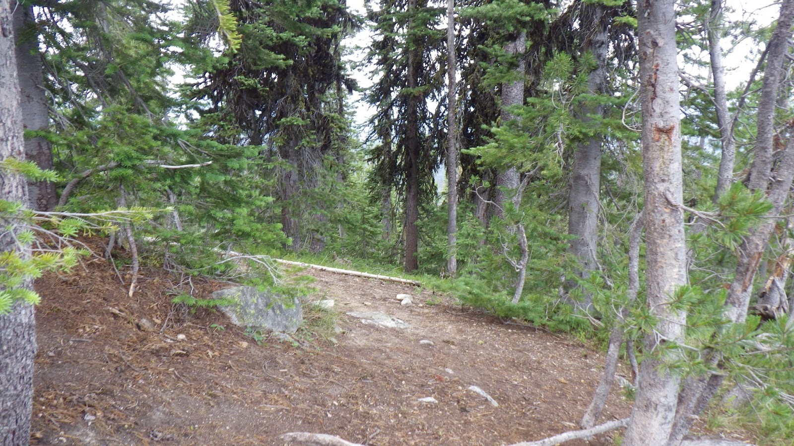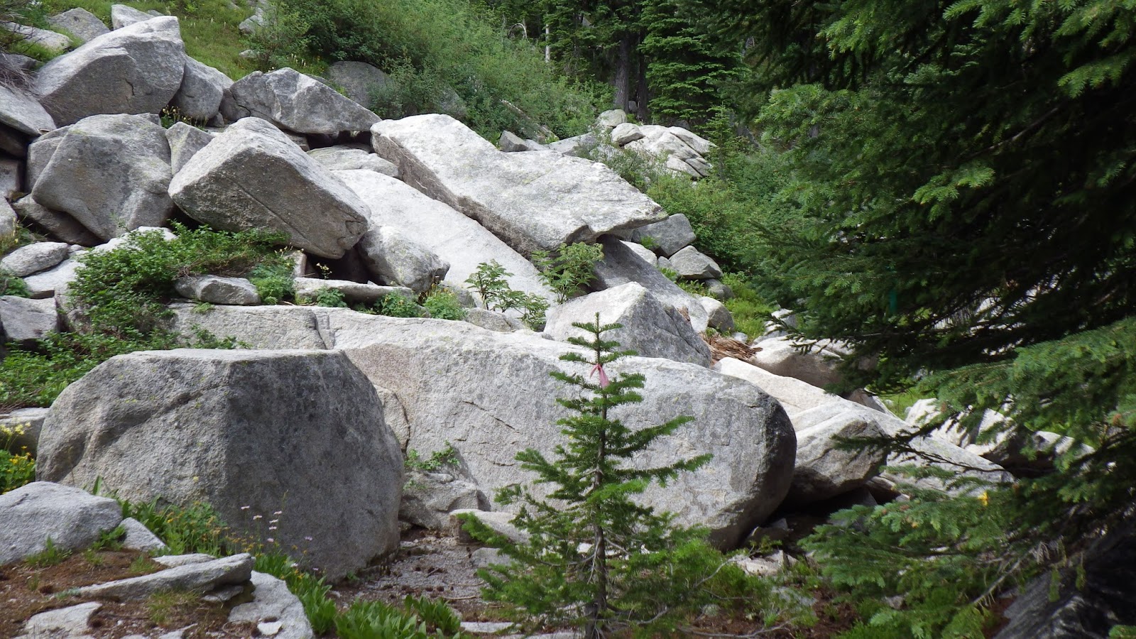 There – that was the three rock cairn, nearly hidden under the low-hanging branches of a conifer. And the trail inexplicably zig-zagged when it could easily go straight across and be a whole lot less confusing. Well, this wasn’t really a trail. Not officially. So I took matters into my own hands and made sure that the flags we placed were clear. I even kicked over a couple cairns, because they led in the wrong direction. But not all of them, because for all I knew, there was another trail coming from the other direction. I believe I helped make that (no) trail better at any rate.