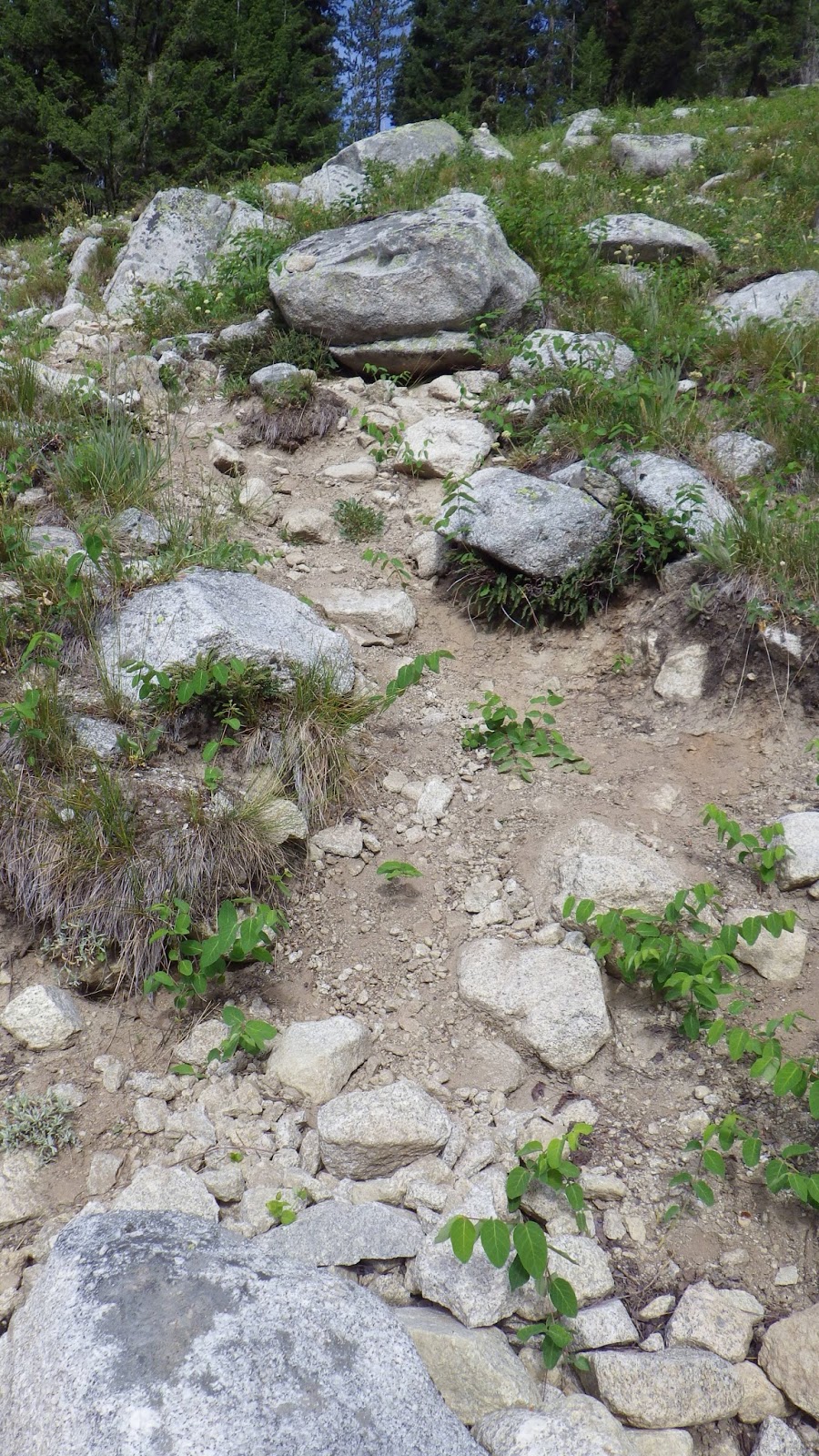 Last year, we couldn’t figure out how to connect the trail we’d found with the one we’d gotten lost from. So instead we went cross country and just headed up to the 2nd lake. This year, we were determined to hook those trails up. Ambrose even brought marking ribbon to make the next trip easier. So we were very careful, very vigilant as we went down the trail and got to the place that got us in trouble.