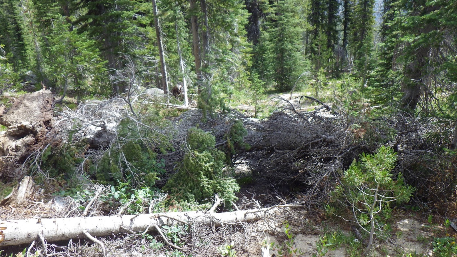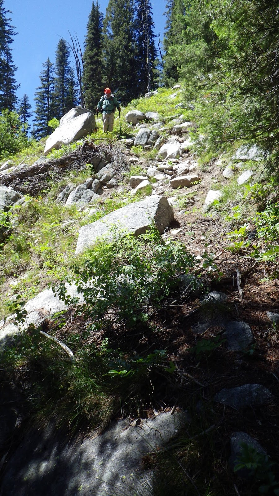 There were no more big surprises on the trail. It was still a steep and bushy traverse up high through a bowl of rock. I waited for Ambrose at the place where two logs cross a ledge of rock. He’s fallen there before, and I wanted to be on hand for help and advice.