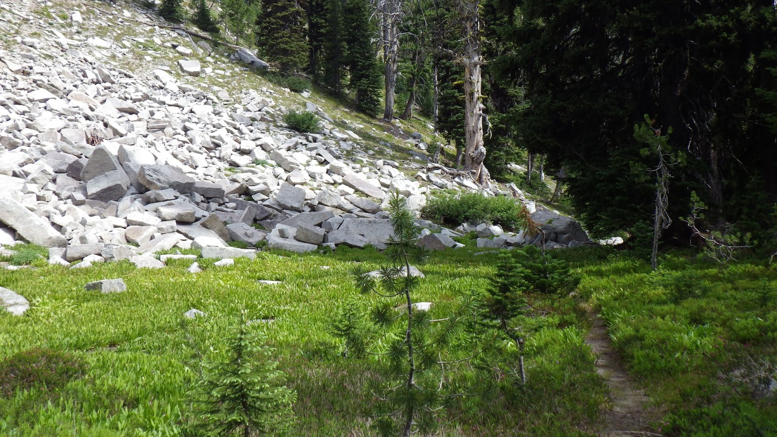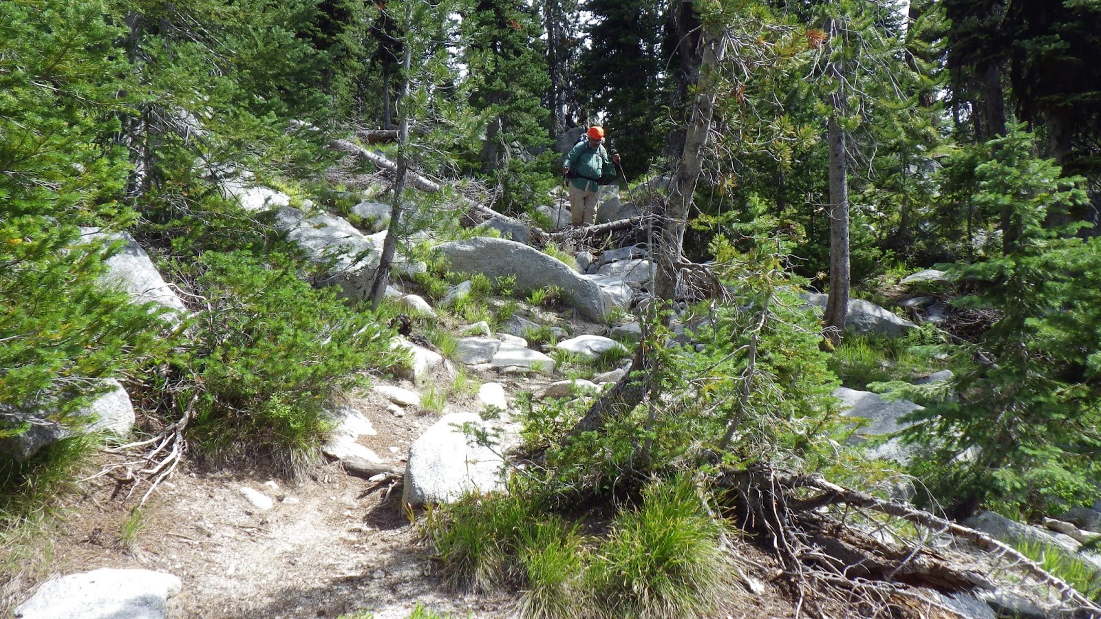 I led the way down around the ridge and then through the rocky section. I walked along, spotted the trail, and then waited for Ambrose. Then I did it all again. We were both moving at a good pace through this flatter section.