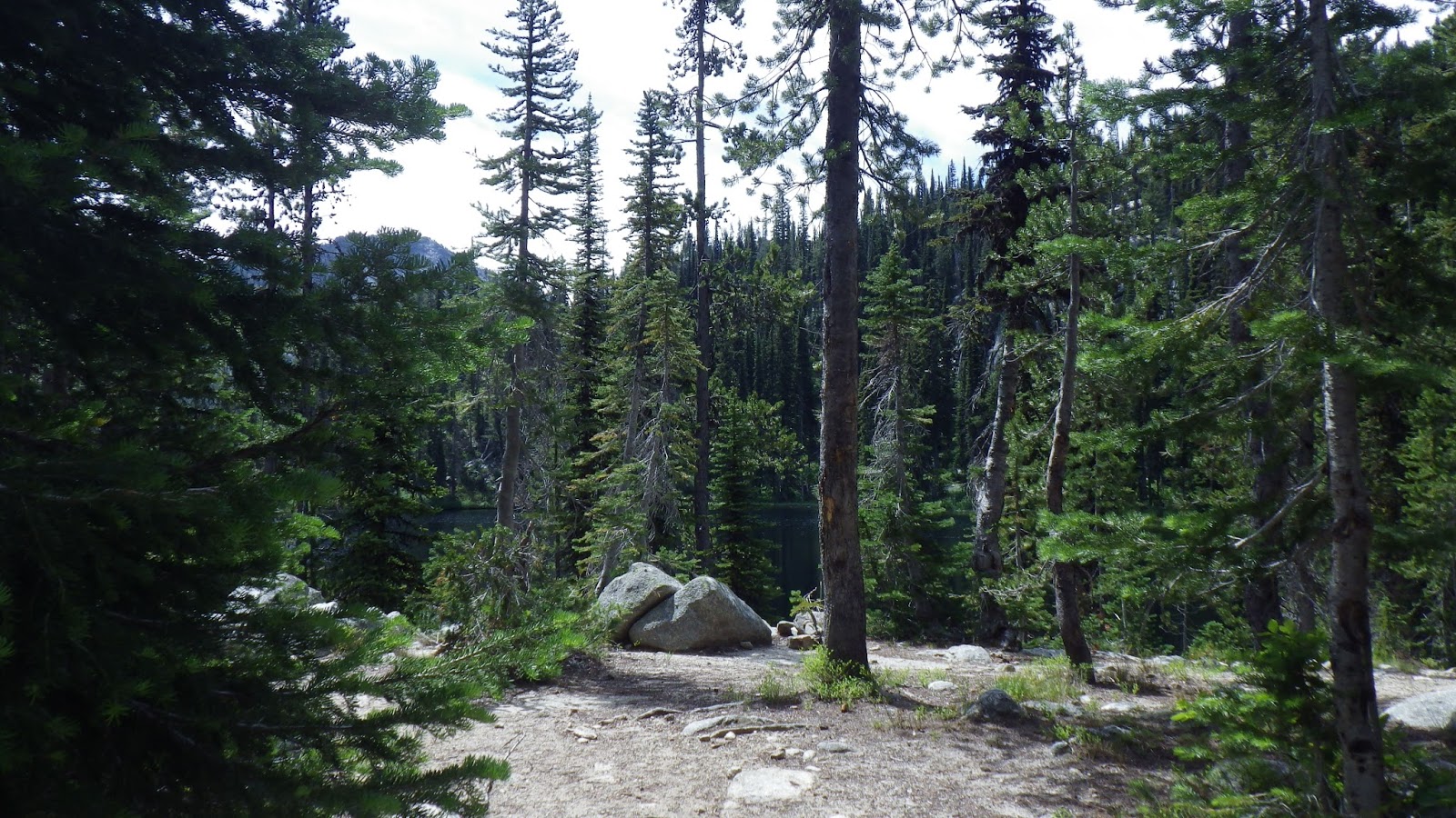 Then we picked our way down around fallen trees and over yet more rocks. Before long, we reached the rocky traverse that led to the first unnamed lake. I continued to lead the way and bounded down to see the water. We’ve never stopped at that lake; it’s always looked too boggy for camping, but it is lovely. Maybe next year we can make that our first night’s stop.