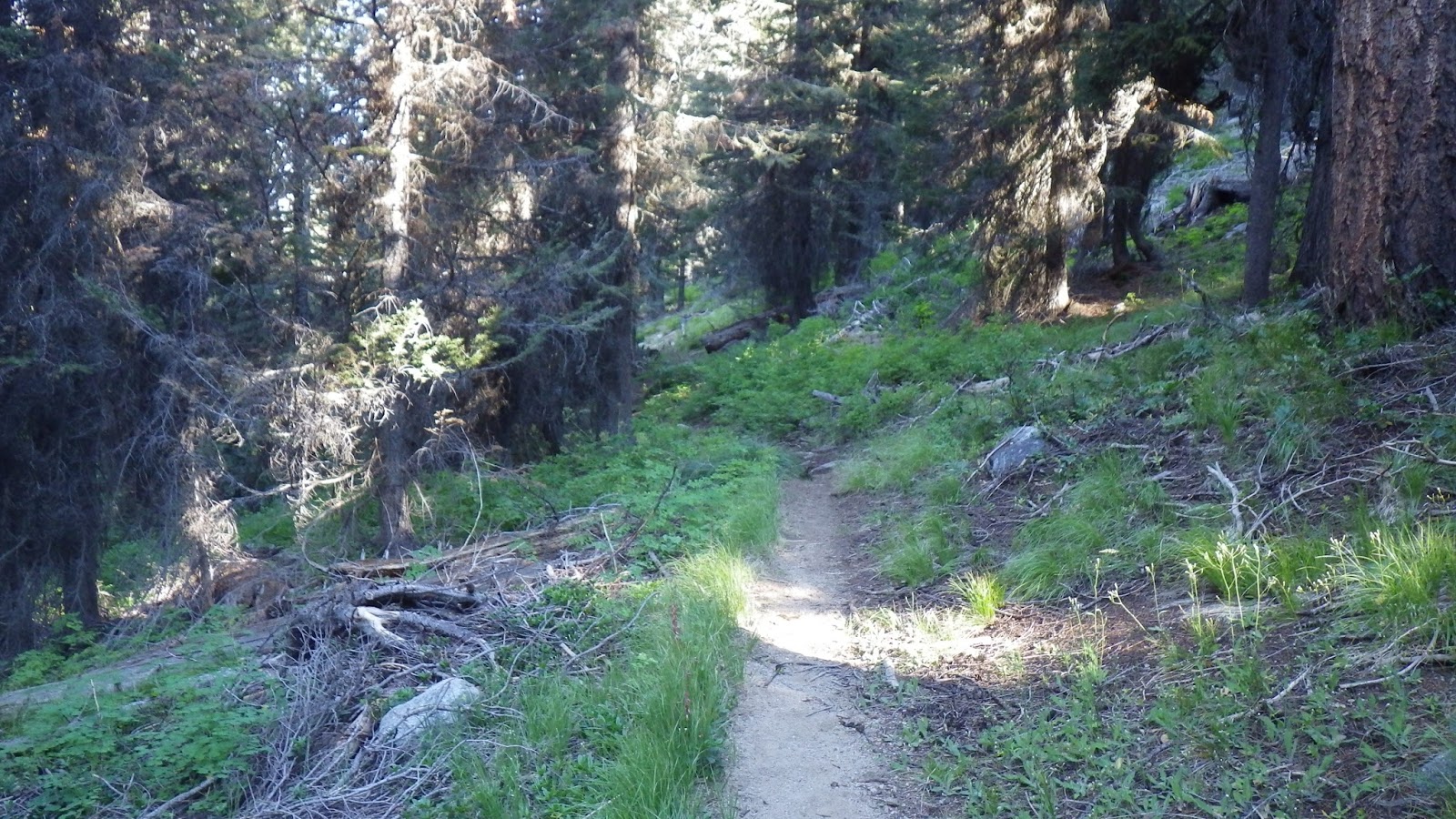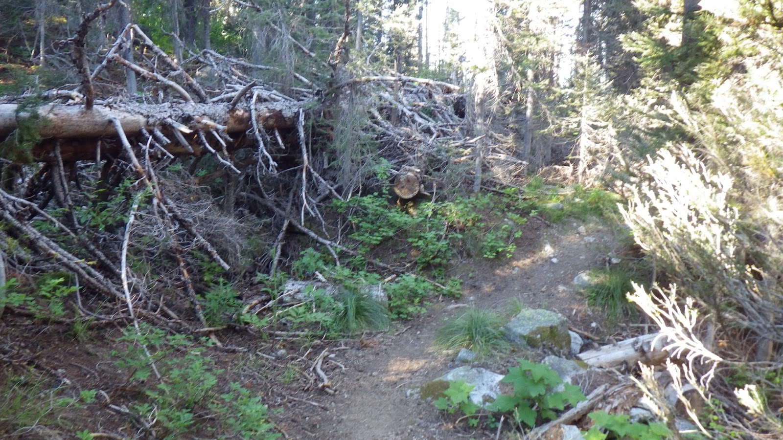 It’s not a long distance from Blackmare lake to Kennally Creek Campground, but the part of the hike that is on unmaintained trails has extremely steep sections, both up and down. I was mindful of the nature of the trail as I began. I held myself back from full zoom speed as I picked my way down from Blackmare to the crossing of the outlet of the second lake, which was again complicated by a large tree fallen across the stream.