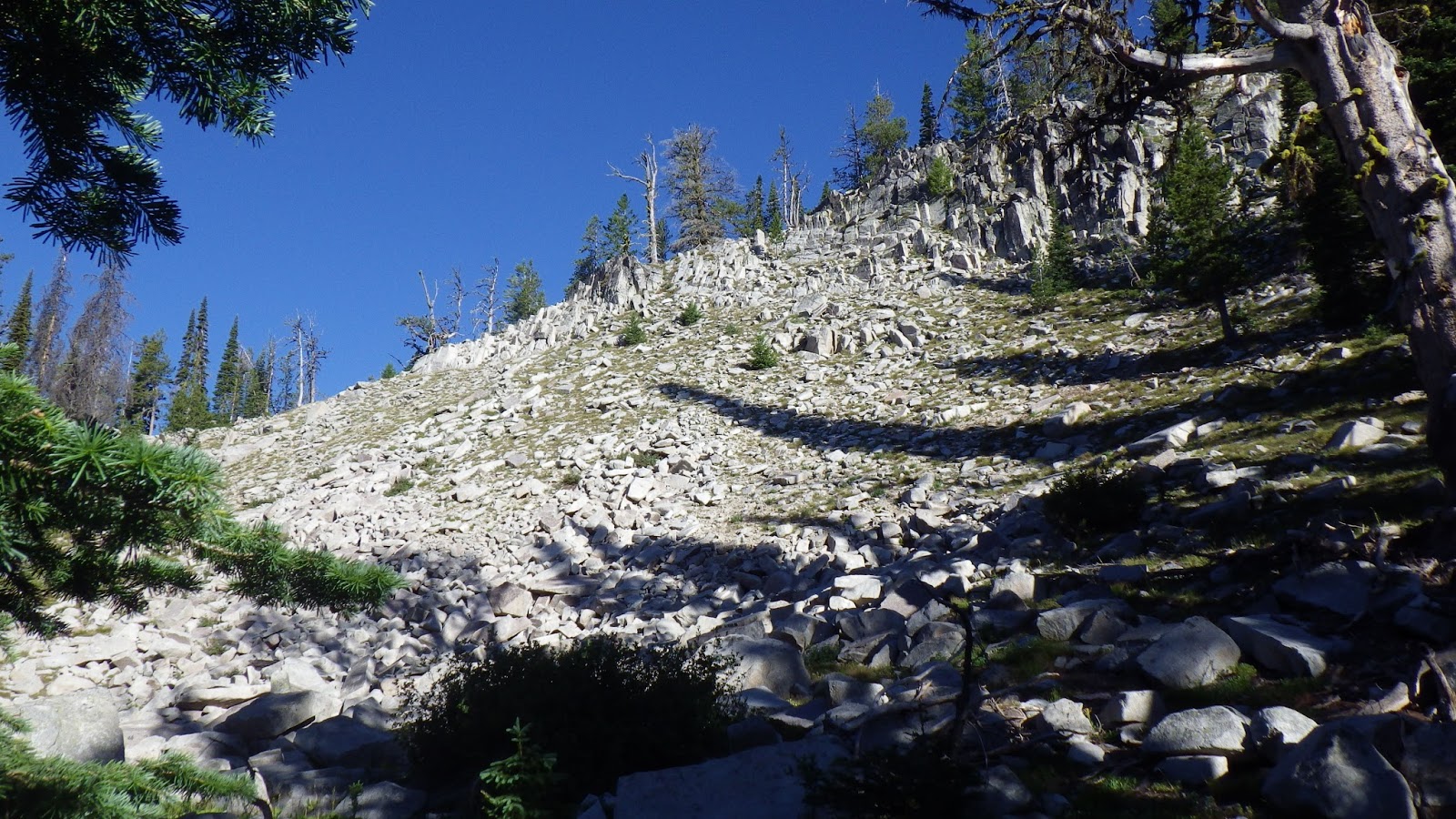 I made it to the lake before 8 am and took a few minutes to sit and finish my breakfast bar. Then I headed on, more uphill to go, to the section where I had gotten lost the last time I traversed it by myself. I took a great deal of care to continue following the no trail’s cairn markers this time and avoided getting lost. I got to the top of the ridge before 9 and started down. I made it up in 20 minutes, so I figured I could get down in 10 or so.
