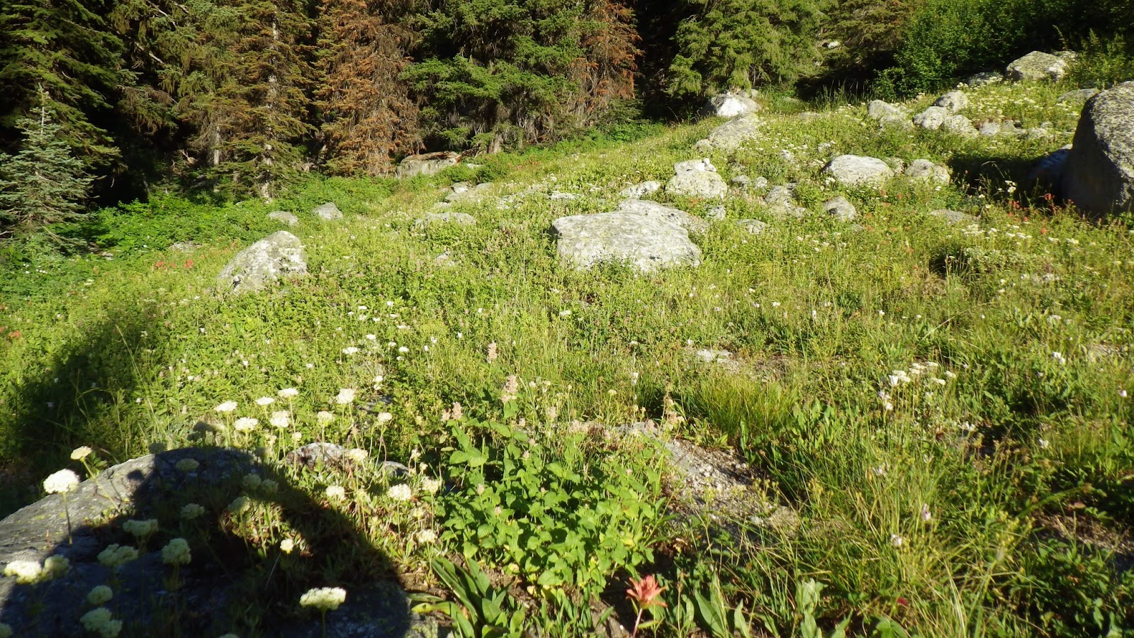 I was more prepared for the trail this time, having just hiked it a few days earlier. I recognized where I caught up to Ambrose, and, of course, the huckleberries were still ripe. I exerted a mighty discipline and only picked and ate two of them while I walked. One from the left side of the trail and one from the right. To be fair.