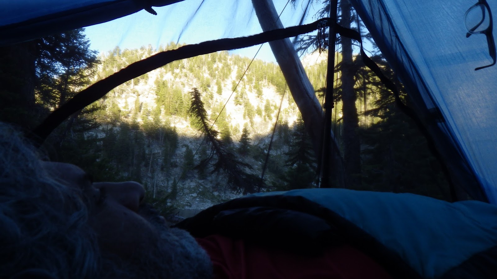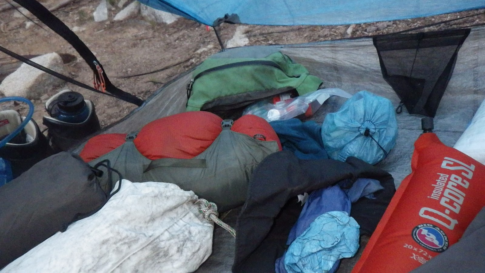 Getting packed up in the morning. I’m sitting on Ambrose’s sleeping pad while I get all my stuff ready to go. |