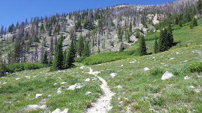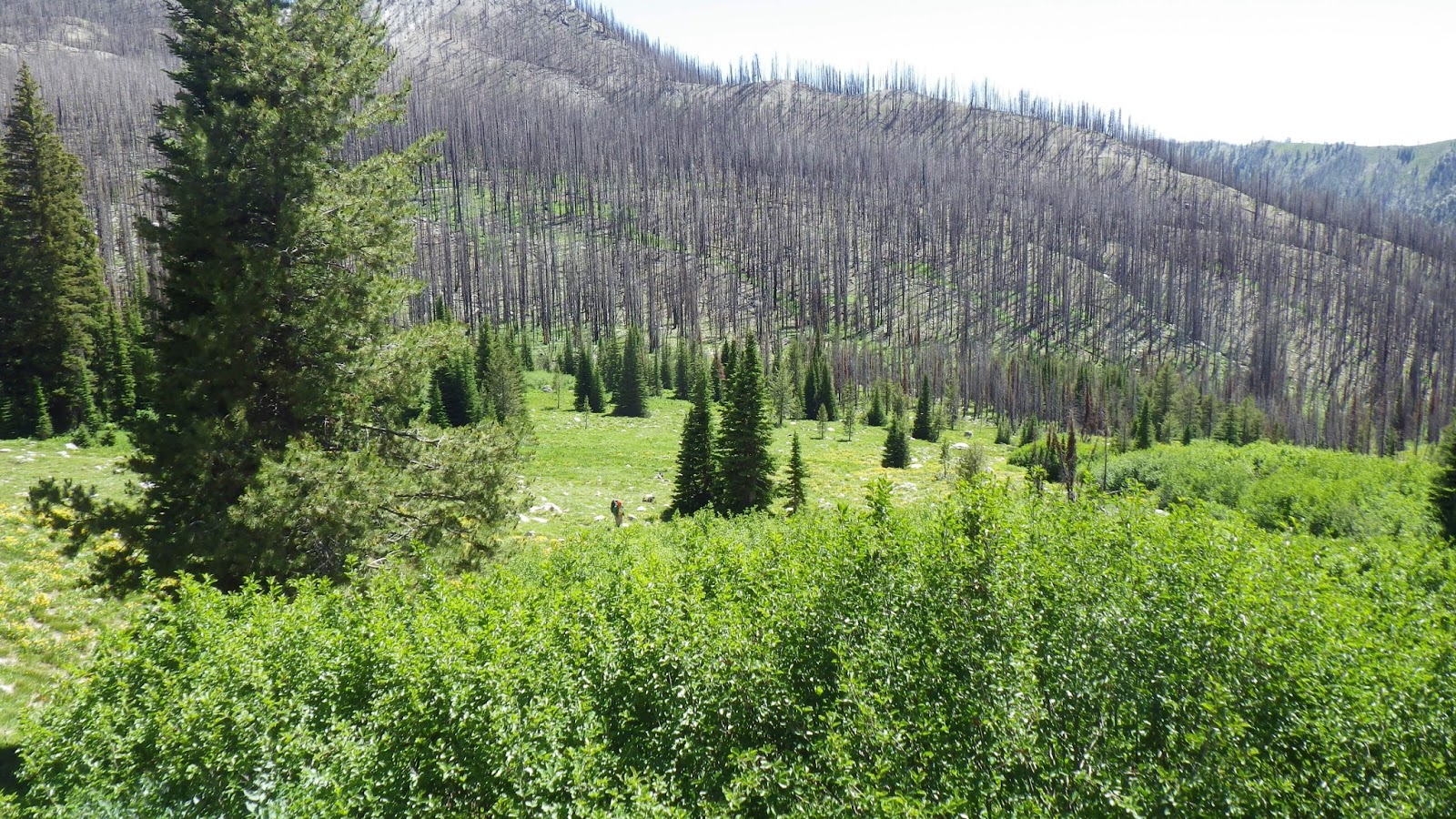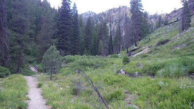 I paid careful attention to the lay of the land as I hiked. I wanted to figure out where I was in relation to where I was going. I stopped to take a picture of a feature I knew to be near the top of High Pass, where we would go if we were to continue on the Queens River Trail. I tried to spot the “alien” tree from last year that should be on a ridge over Browns Lake, but I didn’t see it. And I moved through the valley, watching how the trail turned just as it was about to run into a ridge, and then gave way to the grasses and trees that preceded the ramp.