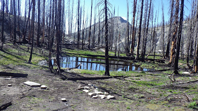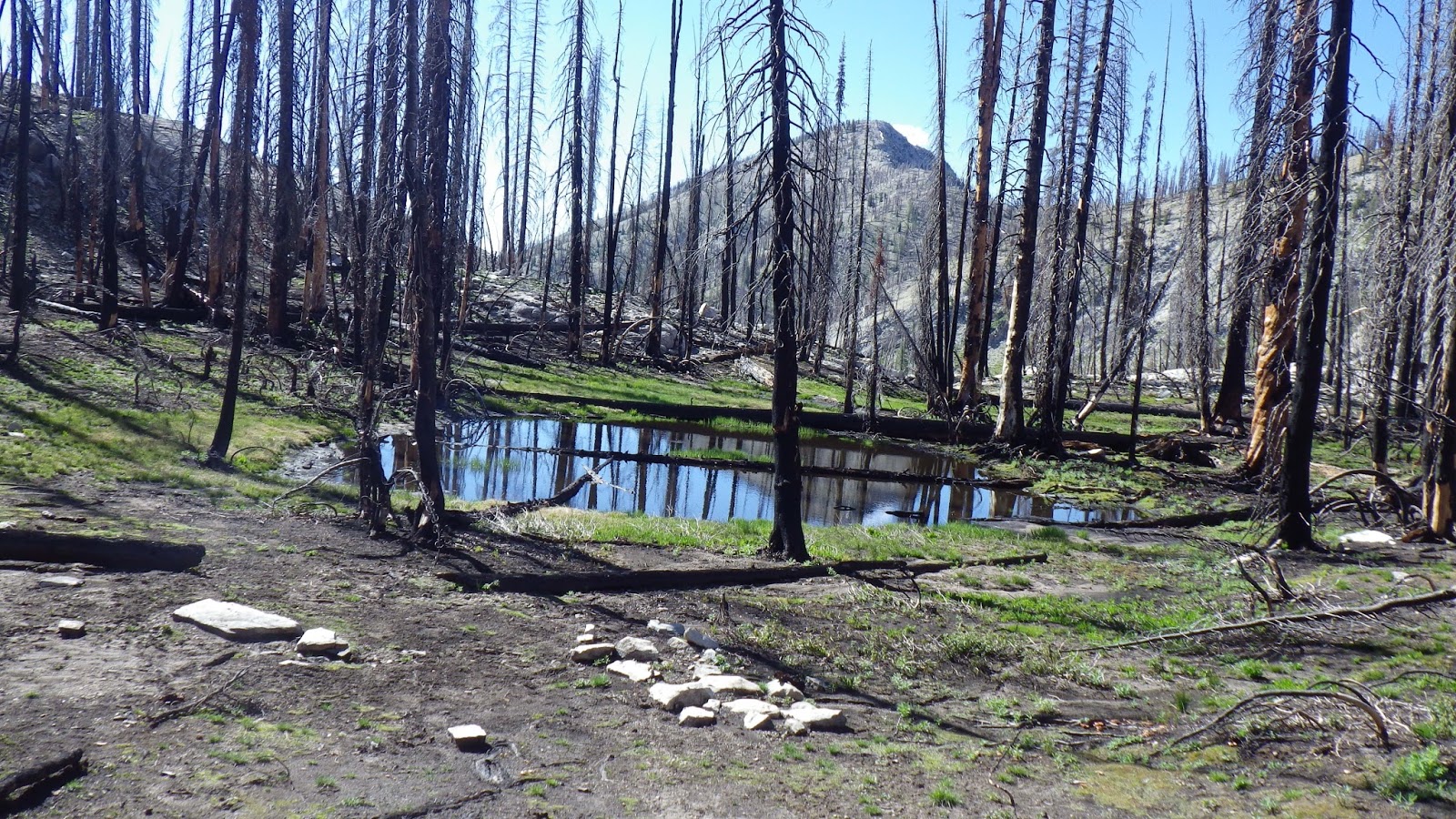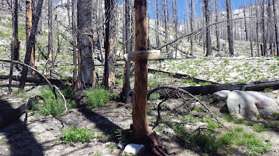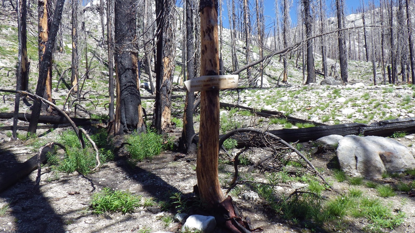 I waited for Ambrose at the trail junction for Browns Lake. I spent some time lying down on a burnt log, balancing myself and trying to absorb as much sunshine as I could. Again, I wanted him to walk up and see me like that, but I got tired of balancing before he arrived.