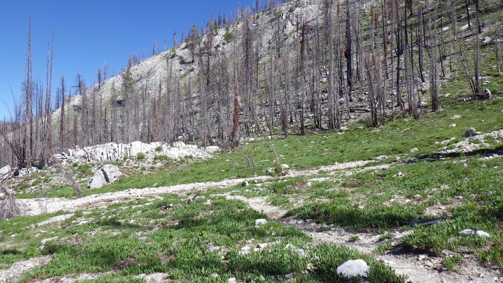After we were packed up, I gave one last longing look to the snow covered approach to Browns Peak, and then we headed out. We stayed close together on the trail down from Browns. Even feeling ill, I still found myself having to stop and wait for Ambrose.