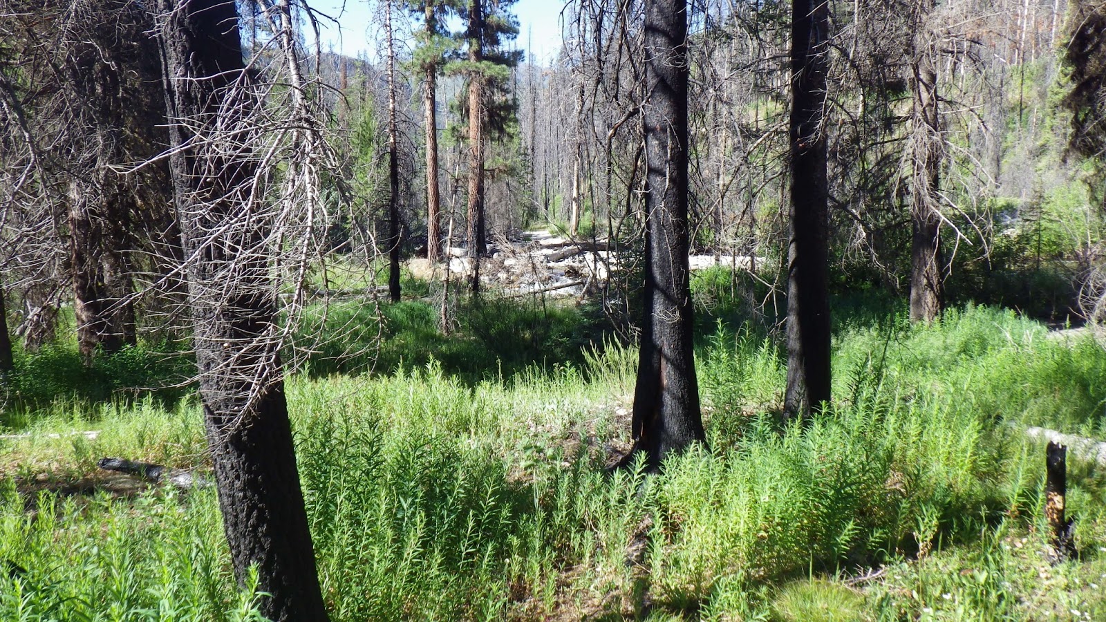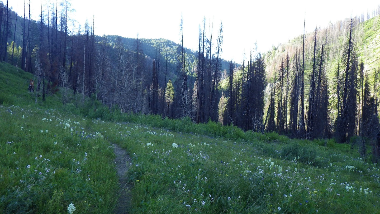 I did have a moment of panic when I approached the switchbacks down to Scott Creek. A crashing sound on the ridge above me made me gasp and look up. It was a young buck, who looked just as startled to see me as I was to see him. I regained control over my breathing and hiked on.