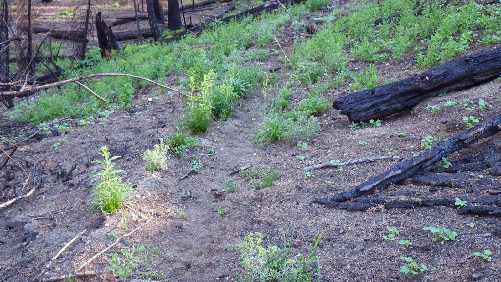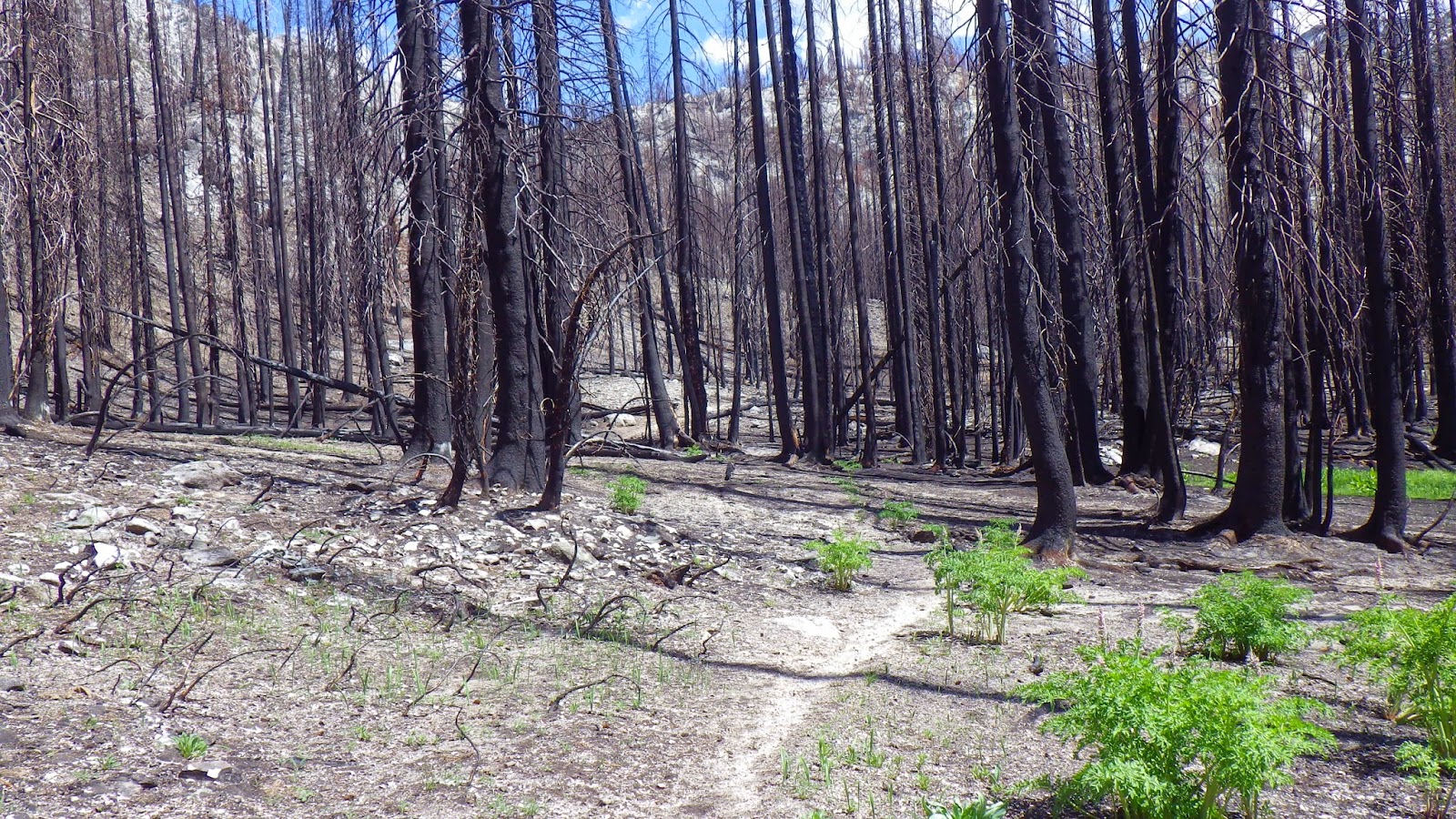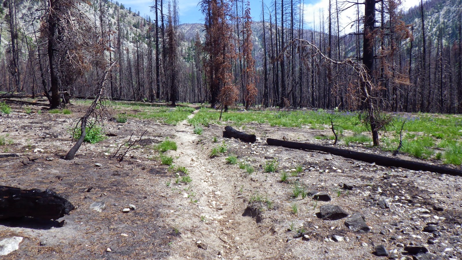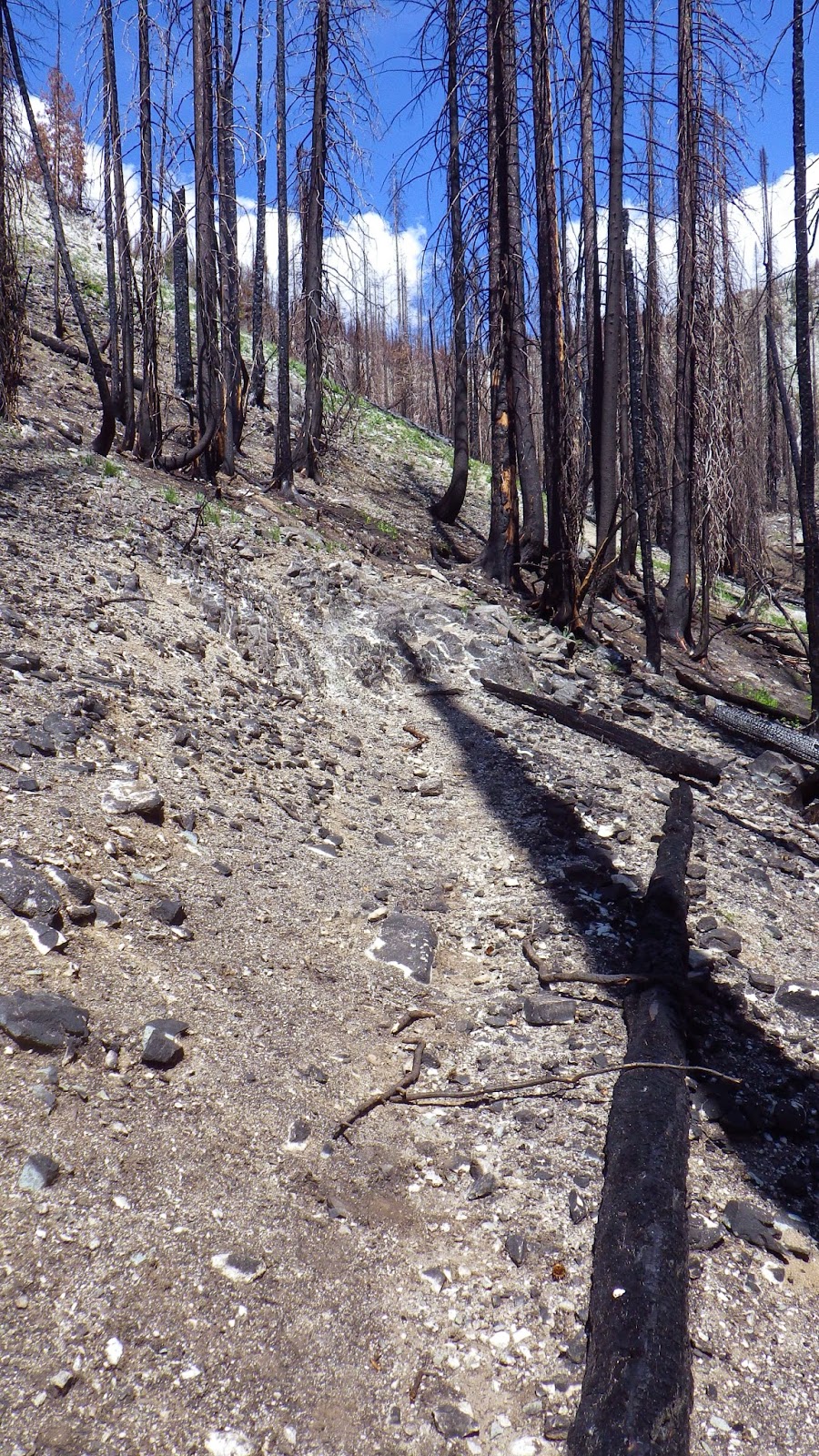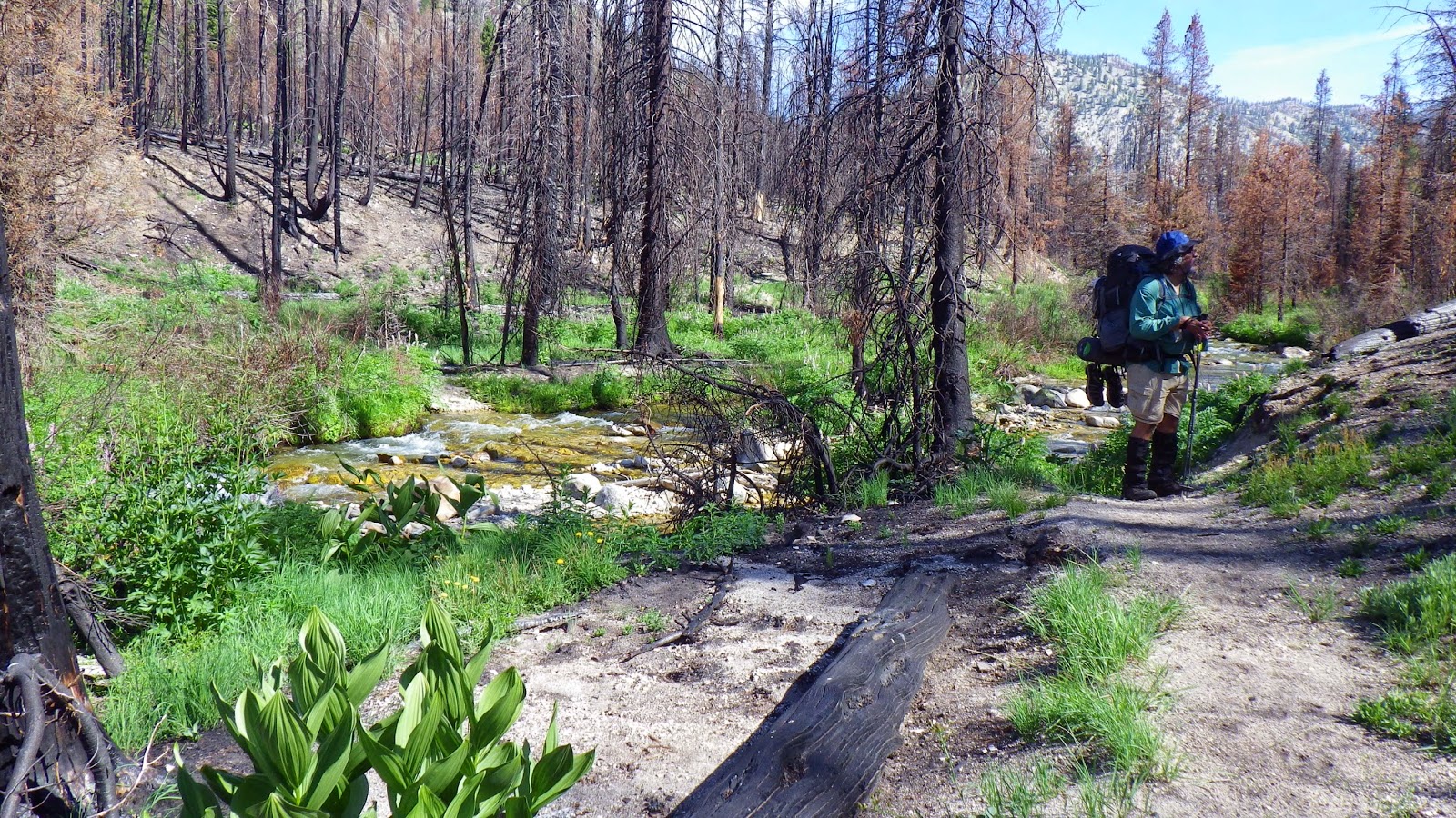 Then it was back to the trail. The landscape continued to shift between areas of green and blackened forests. We had to navigate a few rocky streambeds that seemed wider than they should be, considering they were running completely dry. The trail was marked mostly by being trail-like. So far in the wilderness area, there were no blazes on trees and very few cut logs. But the places where others had walked before us was well defined, even through the burned areas.