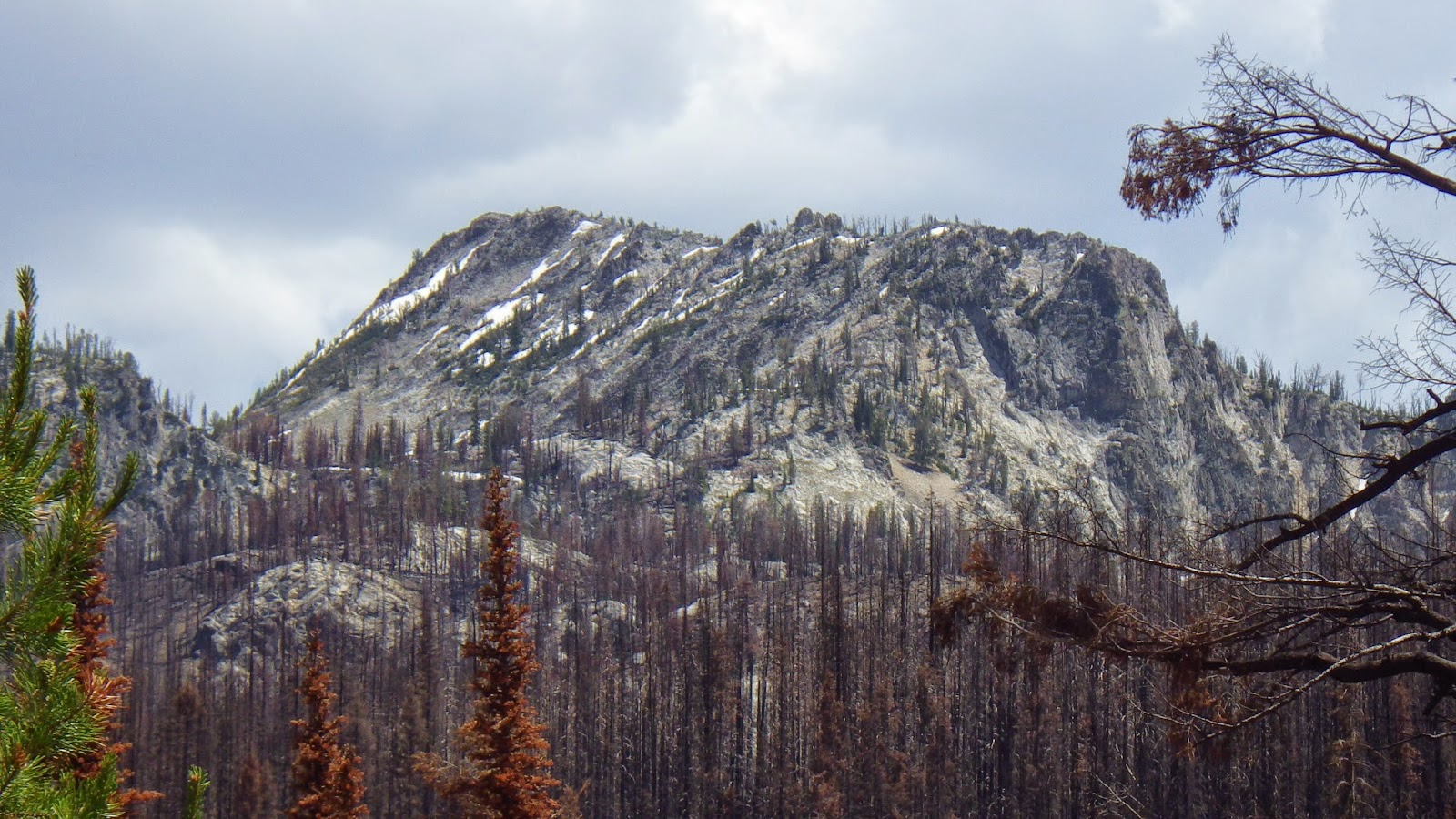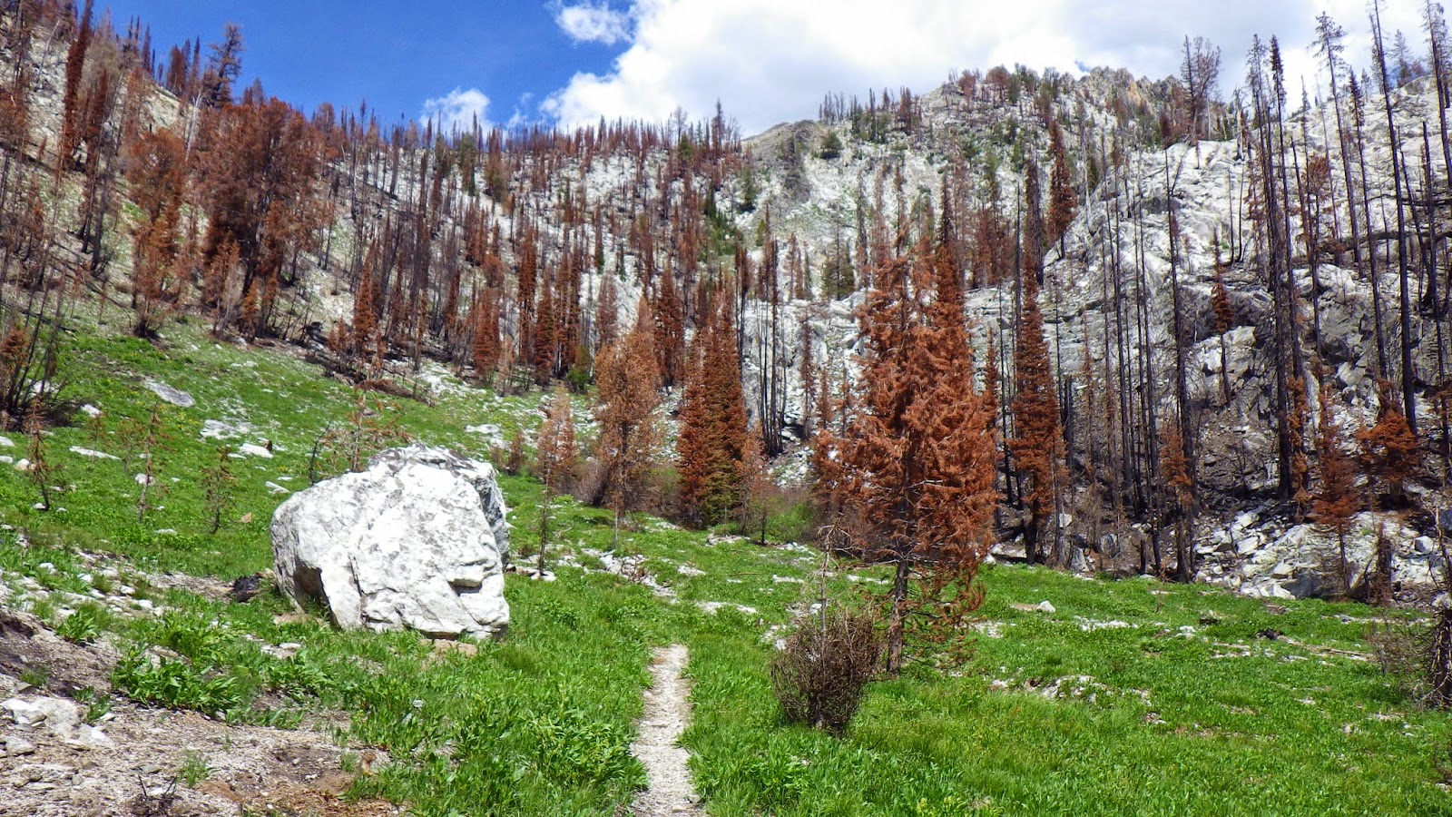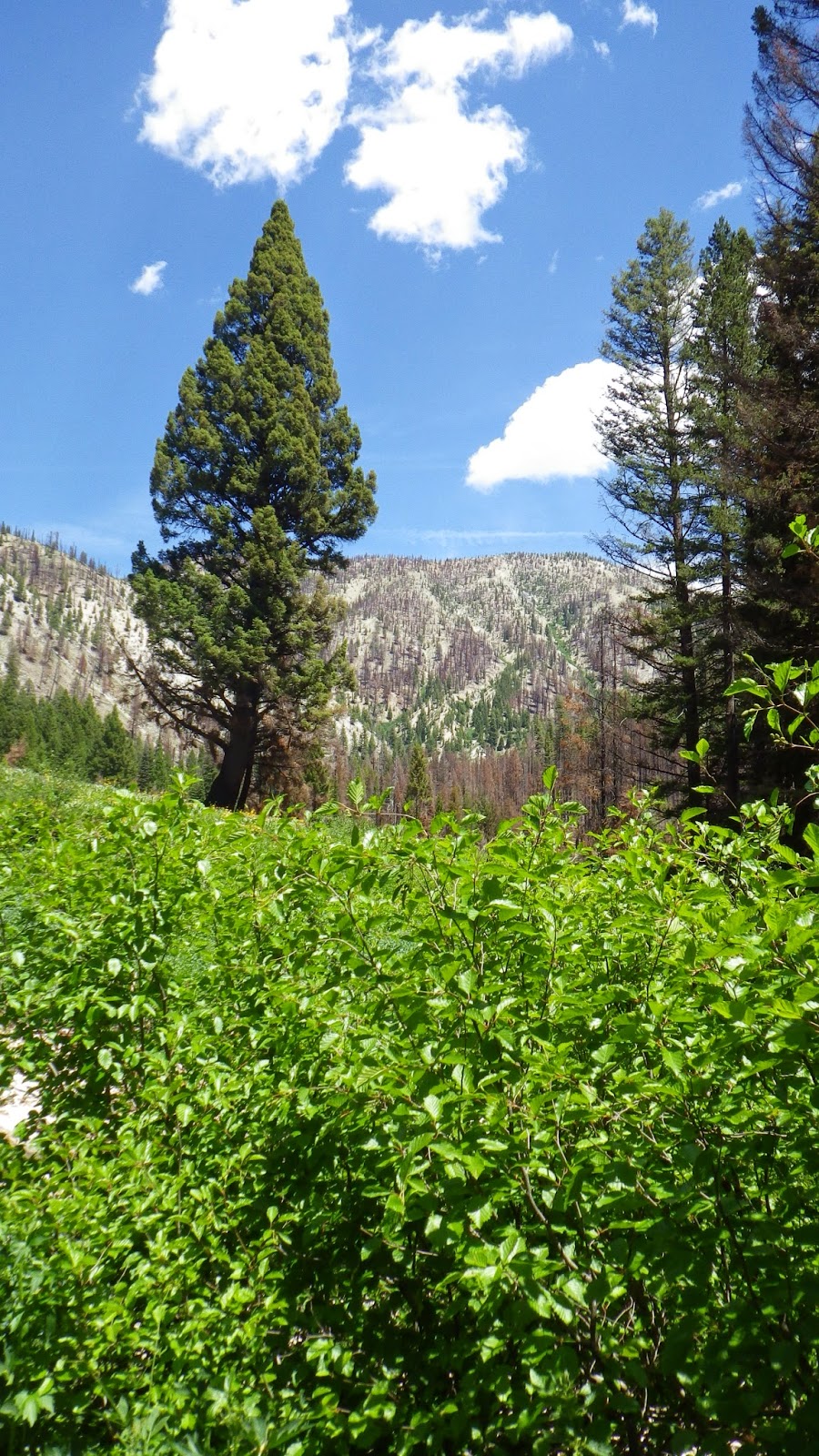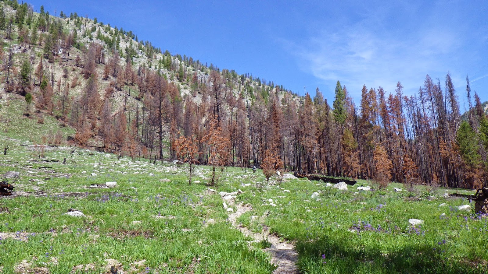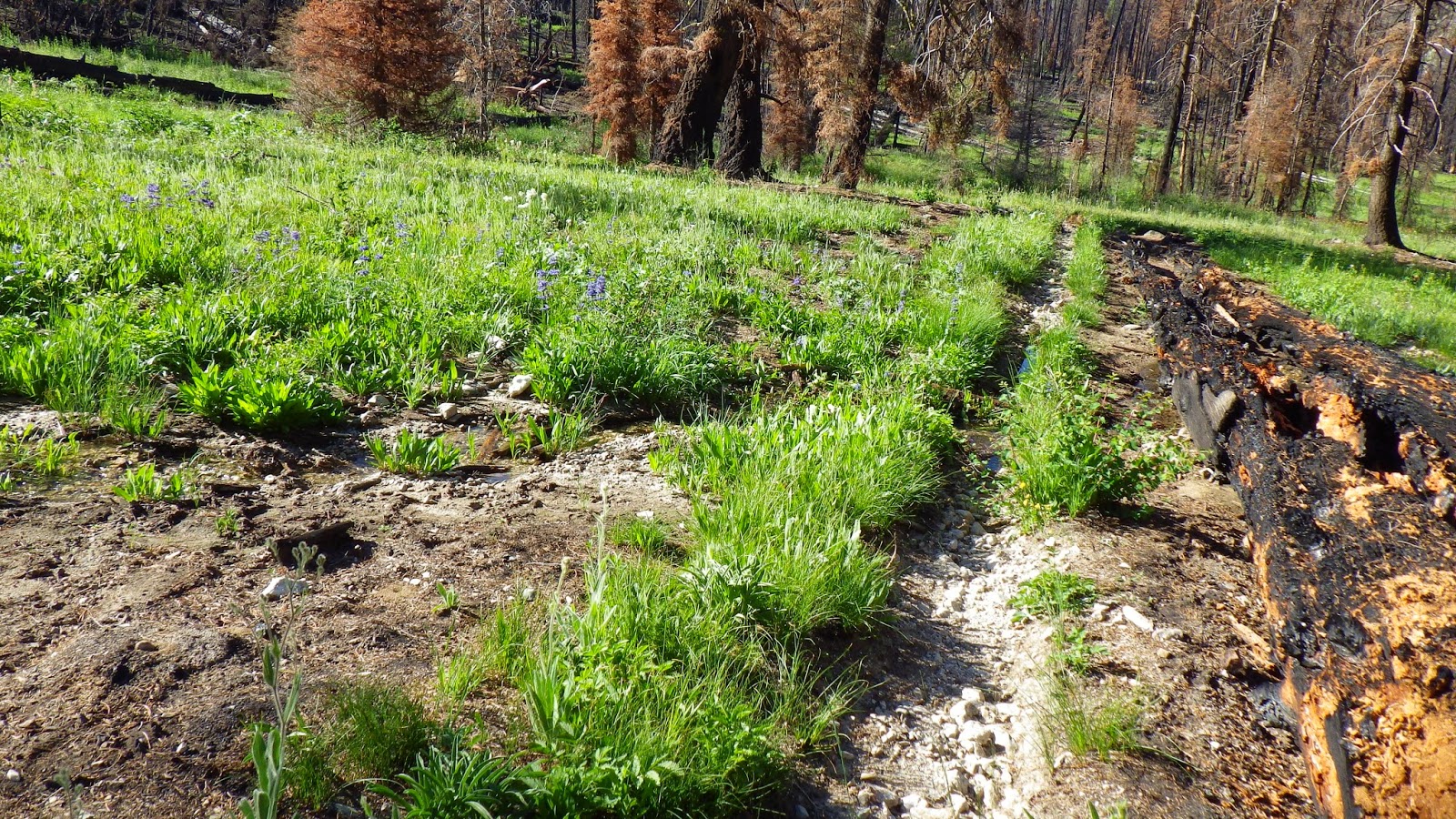 Then it was back to the trail. The landscape continued to shift between areas of green and blackened forests. We had to navigate a few rocky streambeds that seemed wider than they should be, considering they were running completely dry. The trail was marked mostly by being trail-like. So far in the wilderness area, there were no blazes on trees and very few cut logs. But the places where others had walked before us was well defined, even through the burned areas.