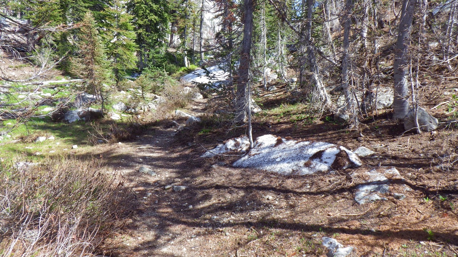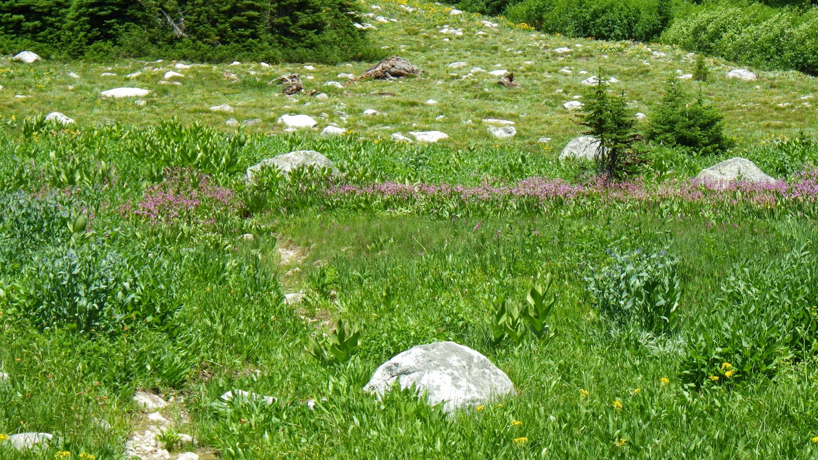 In a wide, intensely green meadow, I found a trail unmarked on the map, diverging off to our left. I checked my map and decided that it probably led to Diamond Lake. Ambrose confirmed that – once he caught up with me. At this point, I was ranging ahead while keeping him roughly in sight. Soon after that divergence, the trail took a right angle turn to the left, up through a copse of bushes with running water audible but not visible to one side. Then it swung sharply to the right and began to climb up. I emerged from the bushes and tried to see where Ambrose was, but I couldn’t tell. I continued up the trail until I reached the shade of a tree and waited.
