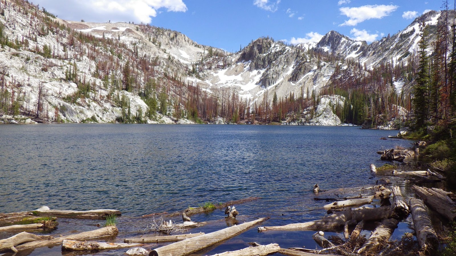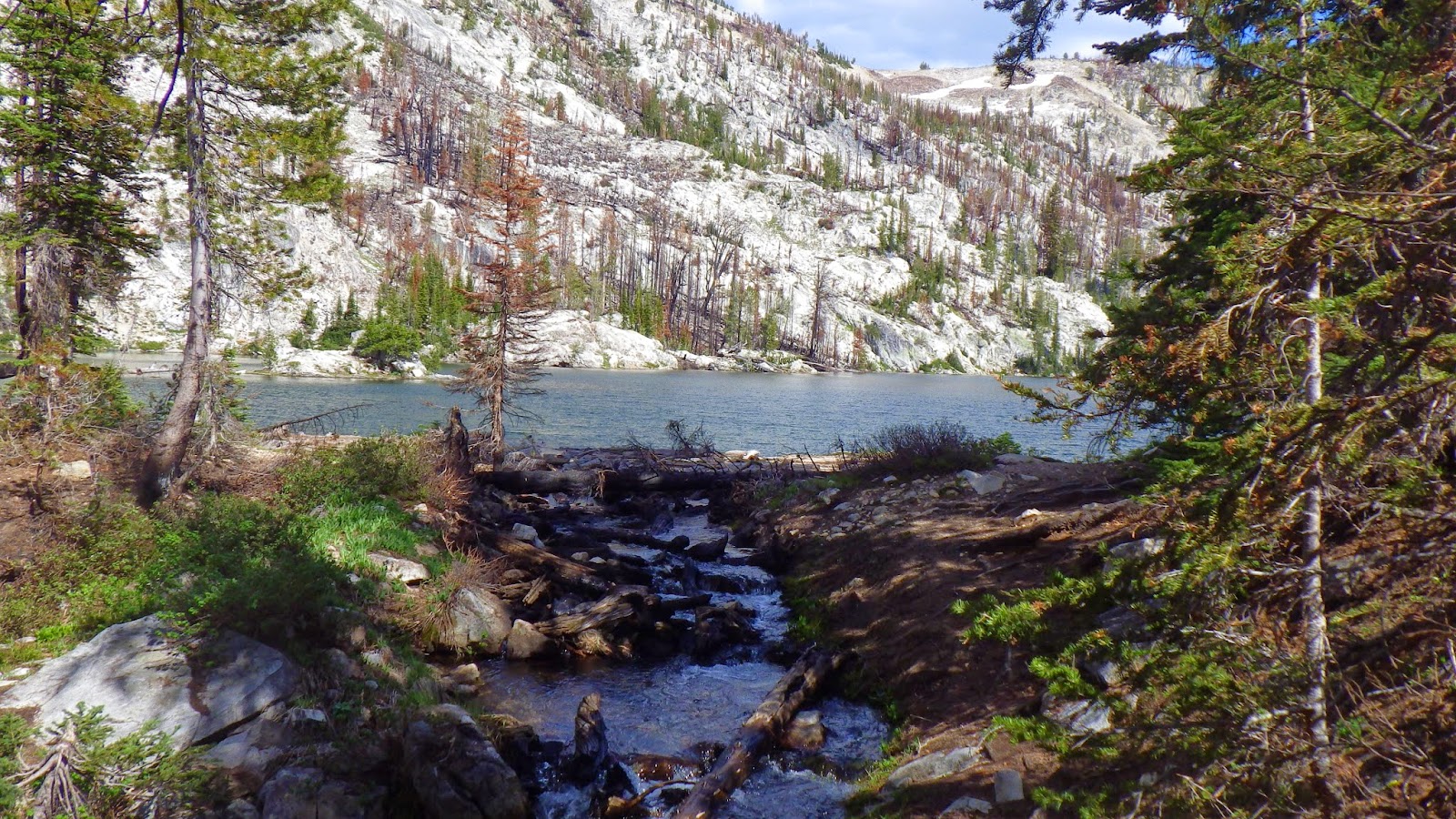 We continued along the trail, which actually disappeared in the fire damaged area. Okay, by disappeared I mean I lost it. . . Ambrose found where the trail crossed the Little Queens, now shallow enough for use to cross without removing our boots. Rocky switchbacks and burned land led up, following the Little Queens until we came to a flat spot, with no obvious trail, and a “lake” in plain view.