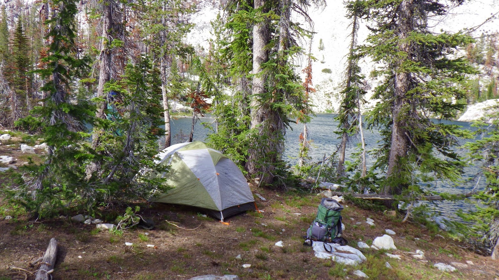 The four other hikers had taken the obvious spot nestled between the lake and the river, so Ambrose and I dropped our packs and I took off on the unmarked on the map, but visible in person, trail to see what I could see. The guy mentioned a place with a fire ring and a sitting log, but I found a place before I ran into that. The land was green, though burn sections surrounded it, and there was convenient access to water. I went back for Ambrose and we hauled our packs up to set up our camp.