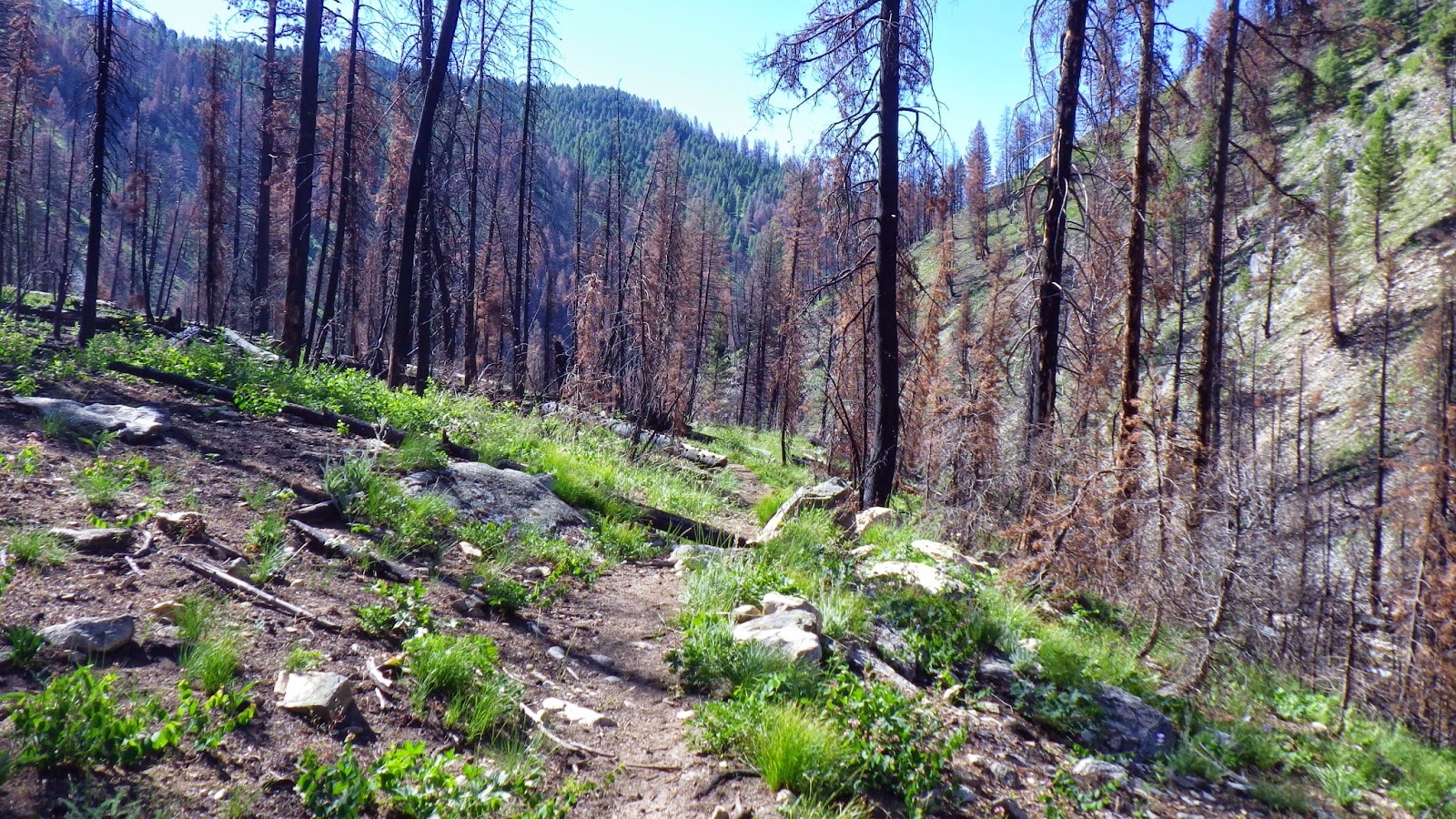 I found where the main trail diverged in part because Ambrose had estimated it to be near a particular formation that we had crossed, and in part because I was keeping a sharp eye out. The trail looked like trail, kind of, but the kicker was the two burned nails in a burned tree. I was willing to bet that that was where the sign for Browns Lake used to be.