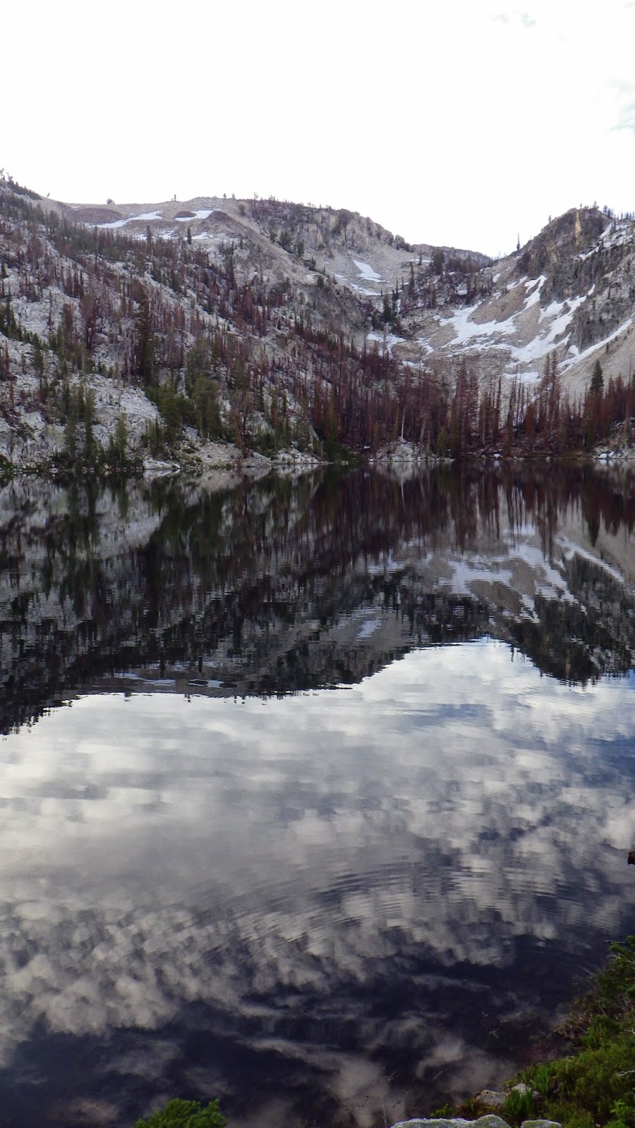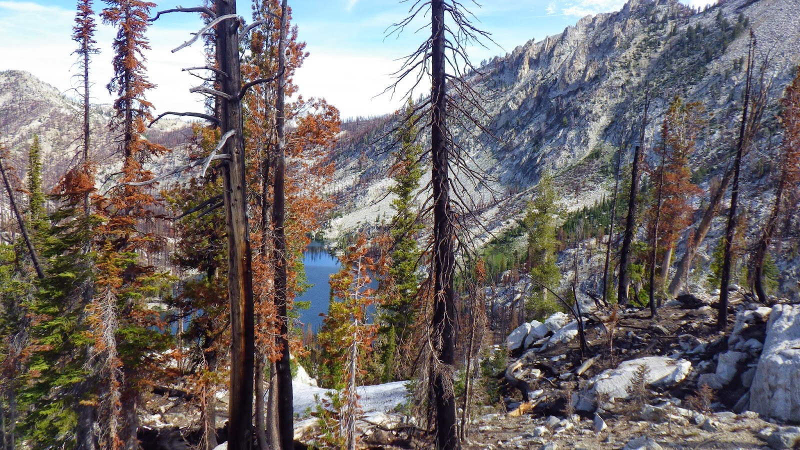 After scrambling up a rocky meadow with a boulder field to our right, we entered a section with burned trees and ashy soil. The ash can be almost as treacherous as snow to walk on. Sometime it will be solid under your foot, and other times it collapses or sinks like sand. We considered crossing a stream to a different ridge, but ended up staying on the one we started on. I thought about walking through the stream as the best way to get to the lake that surely fed it, but we ended up scrambling over tree limbs instead. The lake, when we found it, was a bit of an anti-climax. It was more like a snow melt puddle. Okay, a large snow melt puddle.
