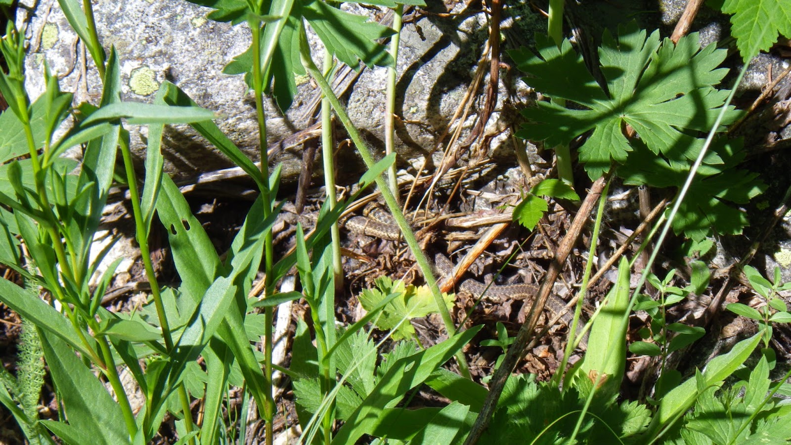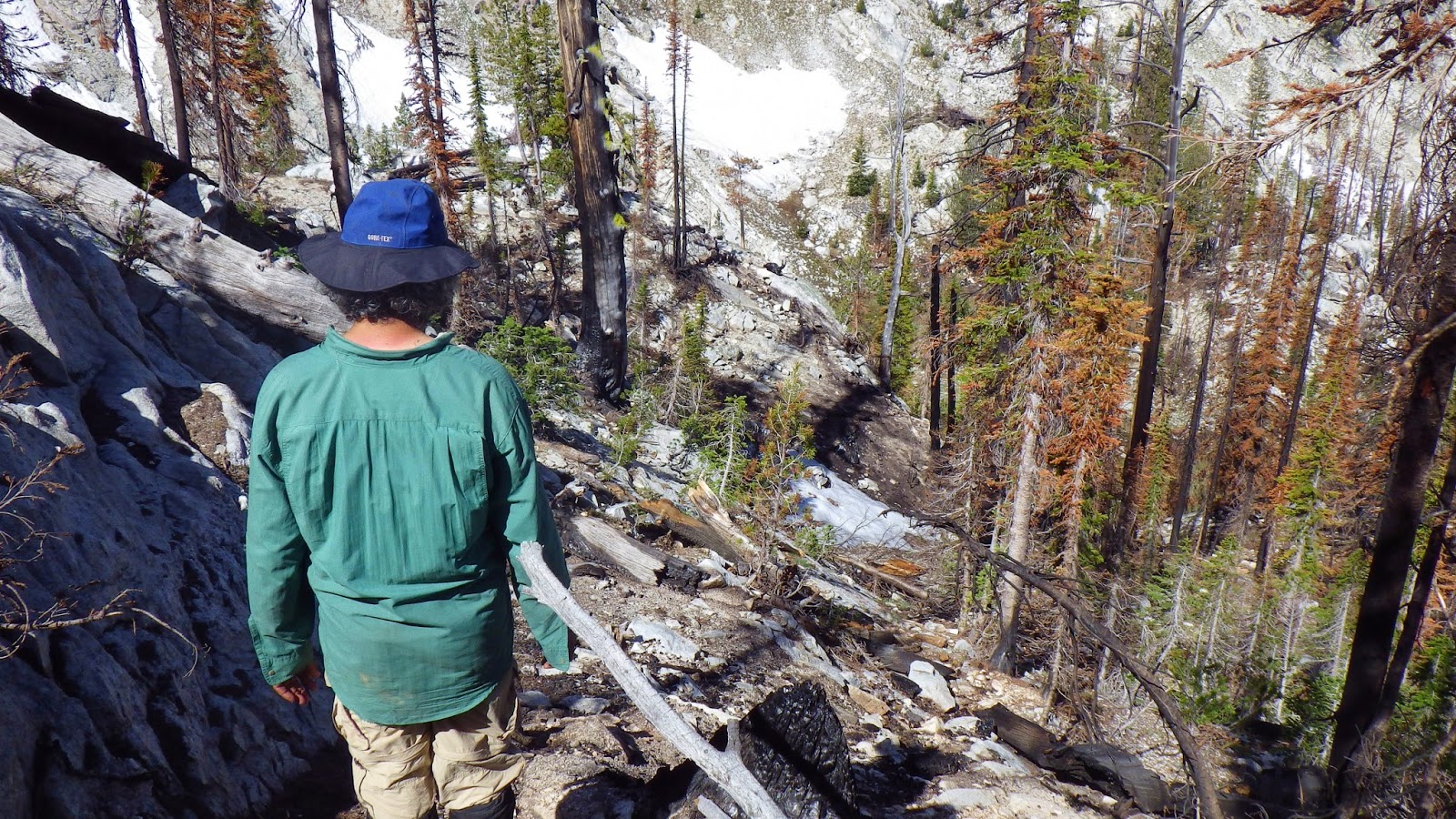 Then Ambrose proposed traversing below a rock wall to try and reach a saddle on the way to the peak. I was game, and we were off. It wasn’t too bad, as long as I didn’t look down. We had one tricky moment with a log that was precariously perched above us. To get by it, Ambrose had to grab it for balance, which caused it to rock. He then held it while I got past its line of fall. Of course, after we passed, it didn’t fall.