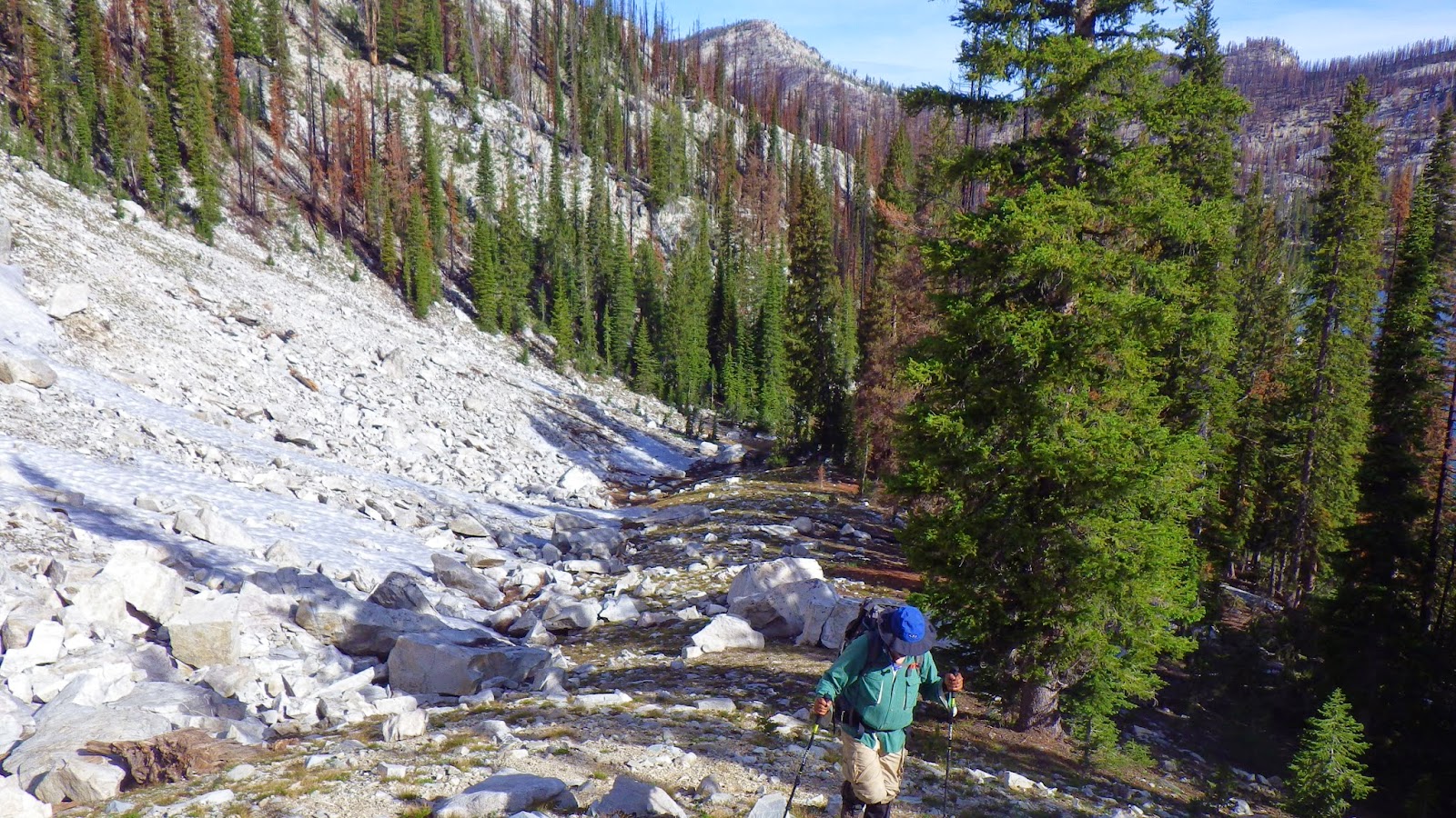 Since it had taken us 5 hours to get to our turnaround and then 3 hours to get back from it on our last trip, I calculated that our 10 hour trip up would translate to a 6 hour trip down. Despite that, we still got up at 5am to head down. We should have gotten out of there by 6, but nature got in the way of that. Nature and the fact that I picked a spot with dirt baked hard like concrete to dig a cat hole. But we left by 6:30, which wasn’t too bad.