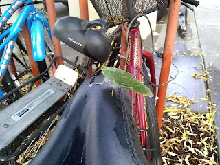 The other day I saw a leaf bug (katydid) on a bicycle seat at my apartment complex. Not my bicycle seat, but one that I pass by on the way to the parking lot. I was enchanted and took a couple of pictures. I don’t know that I’ve ever seen one before or at least one so big.