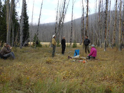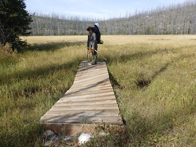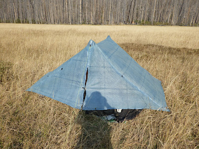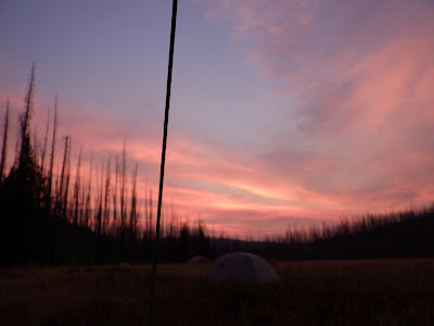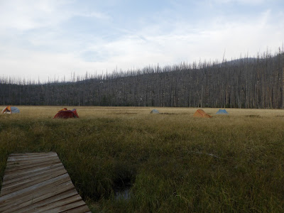 Then my new friend and I looked for a camping spot. We found a fire ring, and a long metal pole. We thought camping at the fire ring would be the thing to do, but when the rest of the party finally joined us, it was decided that we’d pitch in the meadow. The area around the fire ring was surrounded by dead trees still standing, aka widow-makers, so it wasn’t the safe option. And at this time of year, the meadow was dry enough for us to pitch tents.