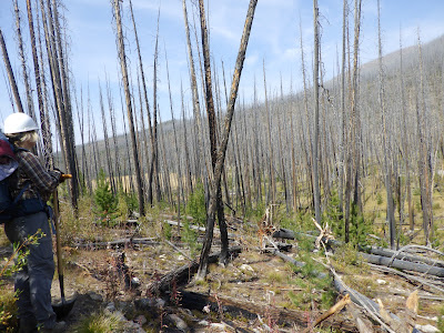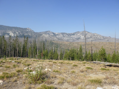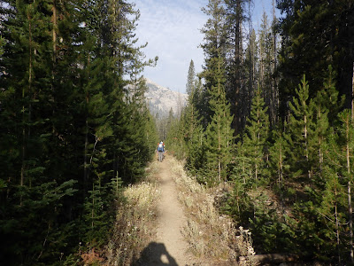The morning was only a little hazy, which was a nice relief after the smoky summer we’ve been having in Idaho. I got some nice pictures of nearby peaks as we hiked the first, fairly flat, sections of trail. Not long after we reached the junction for Rainbow Lake, we found a large tree partially on the trail.